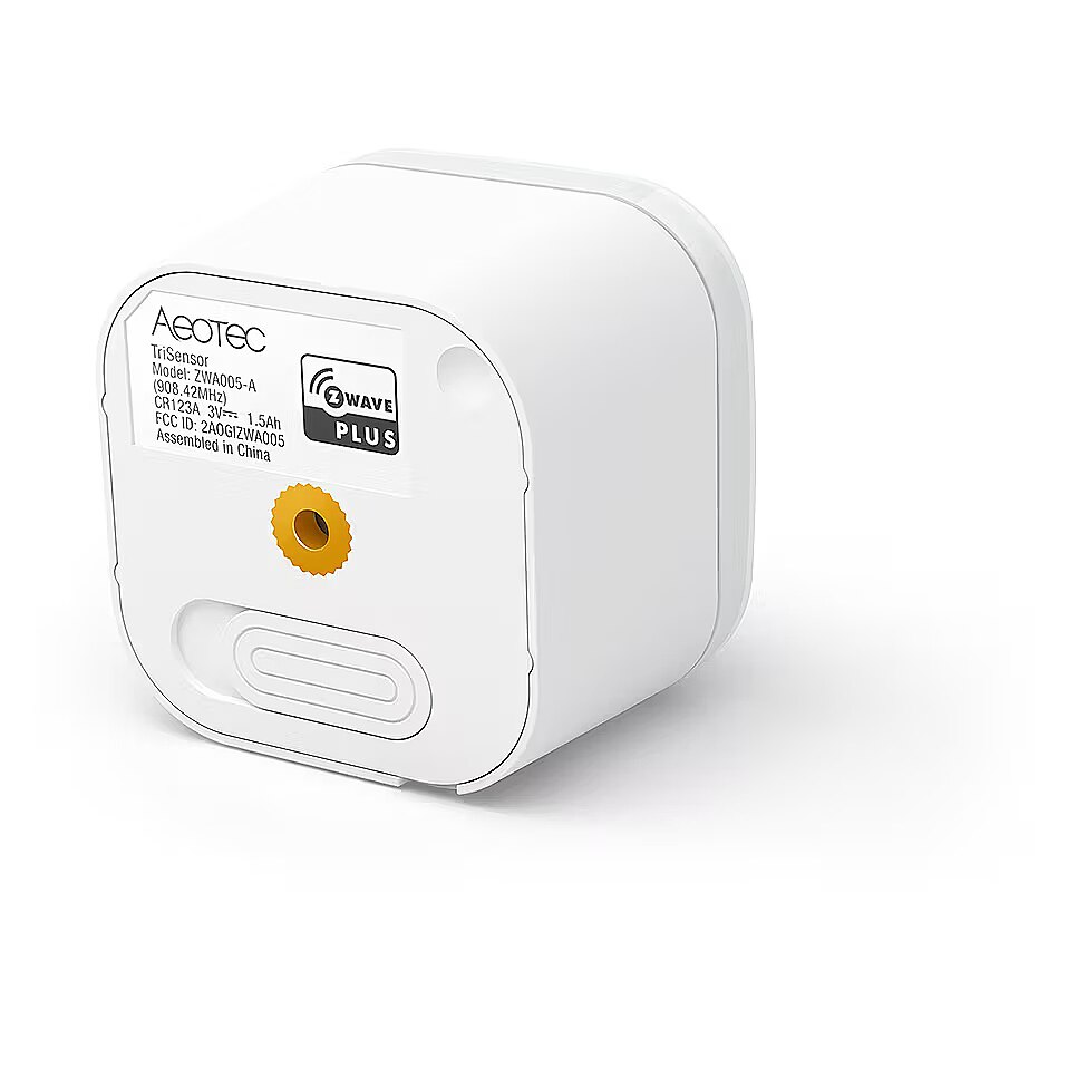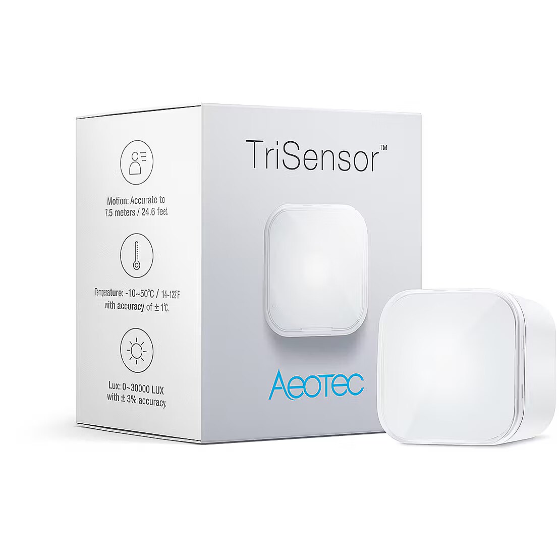 Technical details > Other features - Every Z-Wave Smart Home depends on data for truly intelligent automation; automation that makes a Smart Home actually smart, responsive and secure. The Aeotec TriSensor provides your Smart Home with its most essential data. 3 different sensors are crafted into Aeotec TriSensor’s impossibly small finish. A motion sensor to monitor a room’s occupancy, a temperature sensor to manage its environment, and a light intensity sensor to manage connected lighting. At only 1.77 inches in size and weighing only 50 grams, Aeotec TriSensor is really small. That means it can be placed almost anywhere in your home. TriSensor offers 4 different installation possibilities: in the corner, on a shelf, beam or in the Aeotec Recessor. Motion Sensor The sensor detects motion in up to 7.5 meters distance. It can also be adjusted and calibrated to it needs, e.g. to avoid an alarm by a pet. Temperature The temperature sensor is accurate and detects temperatures in the range from -10°C to 50°C (+/- 1°C). The temperature can be used in connection with heating device. Furthermore the Aeotec TriSensor can control a directly associated device, if the temperature goes above a configured level. Light Measure the light intensity from 0 - 30000 Lux and automate your ambient light in depending on the daylight.