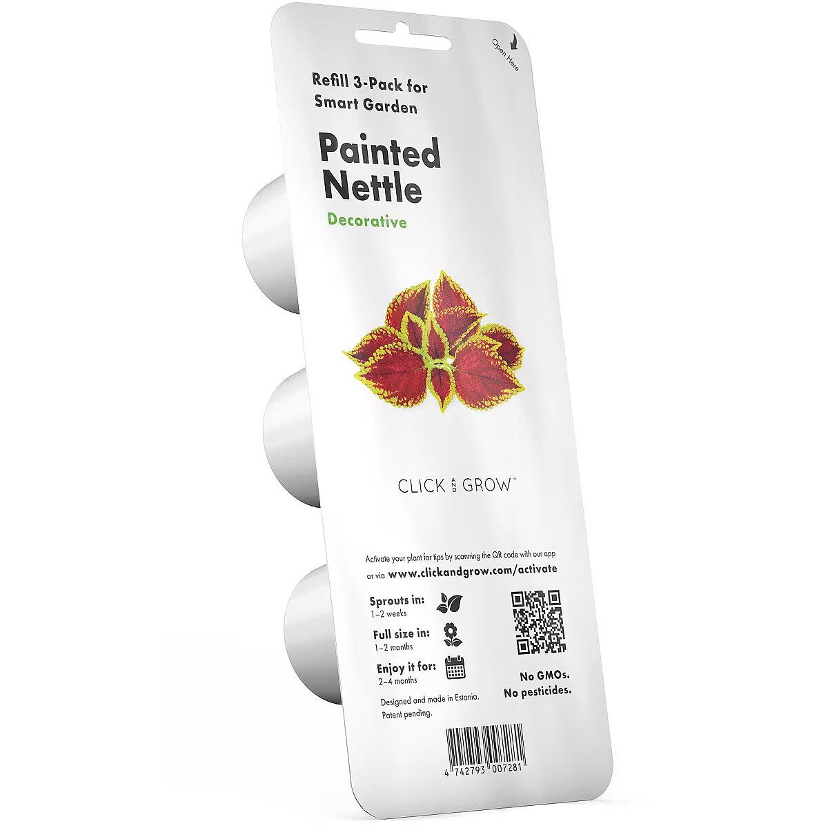description_en - Ideal for putting a little color into your world, painted nettle is an unusually vibrant plant. With leaves that erupt in a wide array of rich hues, from yellow to red to purple, painted nettle is a complete masterpiece. Includes 3 painted nettle seed plant cartridges. This plant can be started year-round with adequate light conditions, sprouts in 1 to 2 weeks, grows to full size in 1 to 2 months and can live up to 2 to 3 months. Use the cartridge only with a Click & Grow Smart Herb Garden (sold separately). We're switching to a more sustainable plant capsule system, and you might receive your plant capsules without the plastic around the Smart Soil. This system works with the older Smart Herb Garden also, just don't throw away the plastic capsules!