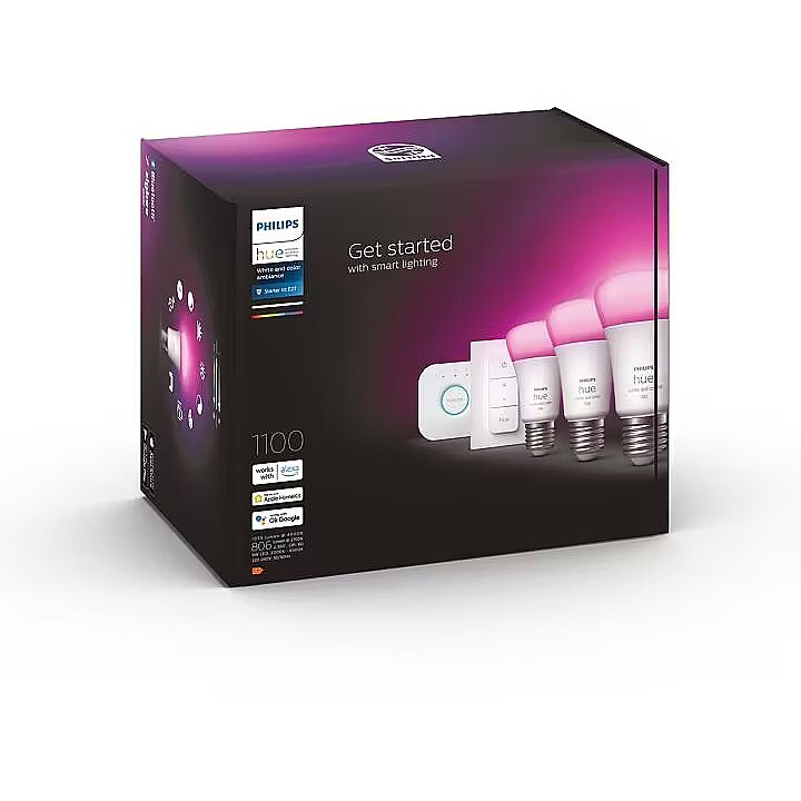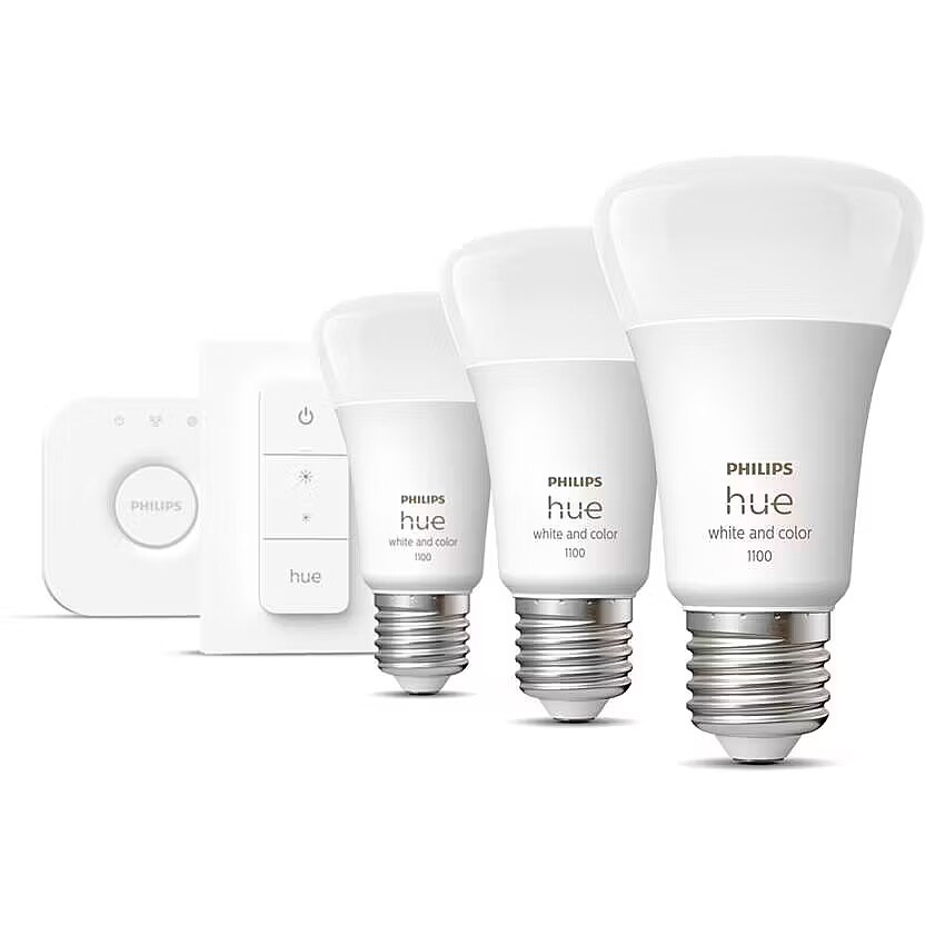Title - Philips Hue White and colour ambience Starter kit: 3 E27 smart bulbs (1100) + dimmer switch