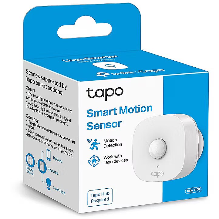 Description - Tapo Smart Motion Sensor Wide Range Detection – Captures motion up to 23 ft.(7m) away and through 120° view. Motion-Activated Light – Control smart lights based on your movement and schedule. Energy Saving – Automatically turn on connected smart devices when you come and go. Instant Alerts & App Notification – Alerts you in Away Mode for anything you want to know. Battery-Powered – Compact battery-powered design supports over one year of use. Easy Installation – Mount it by attached 3M adhesive or supplied magnets.