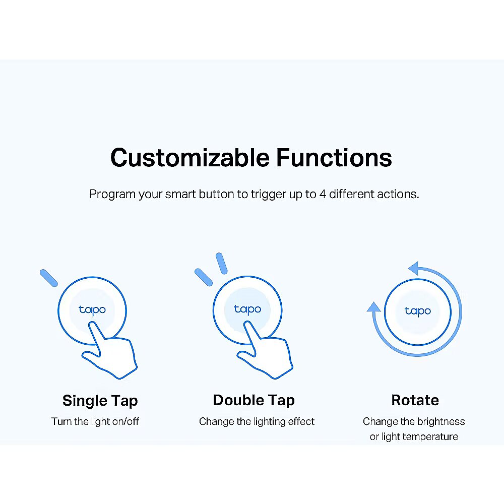Description - Smart Actions – Control and set multiple lights, electronics, and other Tapo smart devices with the button. Customized Actions – Single tap, double tap, and rotating options enable you to trigger multiple actions, from just one button. One-Click Alarm – Family members can use the device to get help in times of need. Control From Multiple Locations – Control electrical fixtures from multiple locations with Tapo smart buttons.