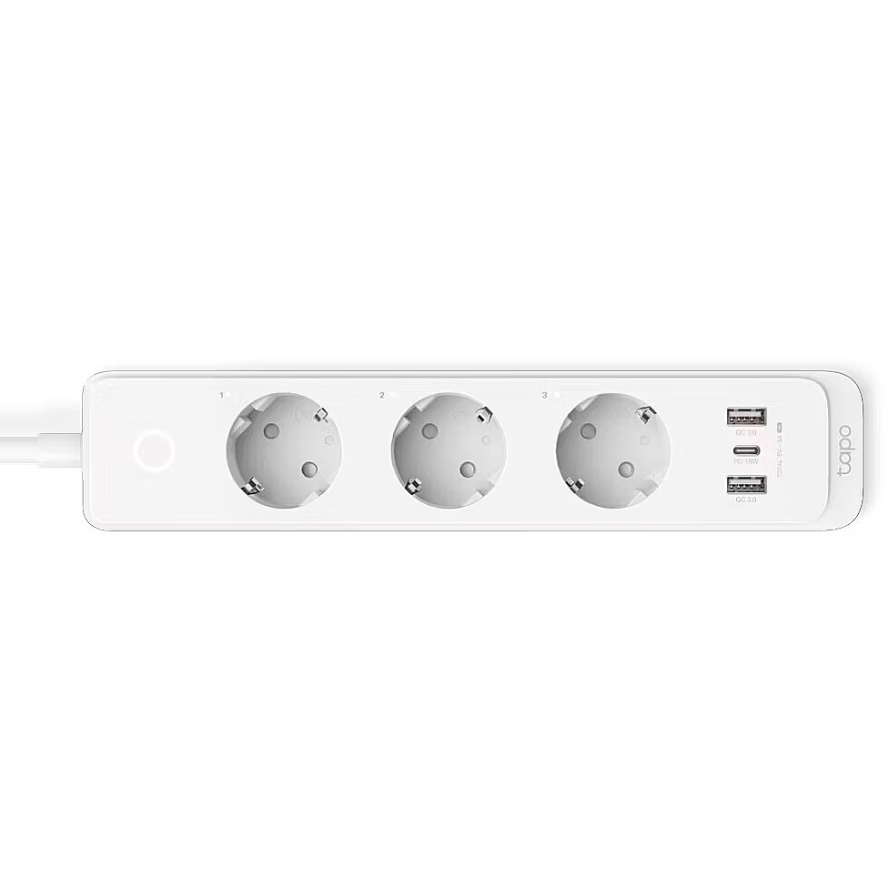 Description - Tapo P300 Smart WiFi power strip Individual control - The 3 output power outlets can be controlled separately from the app or via voice commands. 18W fast charging - Support up to 18W fast charging and QC3.0 for compatible devices. HomeKit support - Control connected devices directly from your Apple devices. Remote control - Turn your devices on and off wherever you are using the Tapo app. Voice control - Manage your smart outlets with voice commands using Amazon Alexa, Siri or Google Assistant. Schedule and Timer - Set schedules and timers to automate connected devices. Out of Home Mode - Automatically turn devices on and off at random times to simulate the presence of someone at home. Easy setup and use - No need for an additional Hub. Configure and manage your device with the free app. Guaranteed security - Multiple security features provide comprehensive protection for you and your family. Power for every device. Tapo P300 Smart WiFi power strip Switch with LED operation indicator LED status indicator 3 Smart Outputs. Individually controlled via app or voice commands. 1 USB-C PD 18W port 2 USB-A QC3.0 18W ports Smart control from mobile devices Manage your connected devices from anywhere via the Tapo app, which is designed to support your lifestyle and keep your family safe. Lack of internet is not a problem Control your devices through the Tapo app, or the Apple Home app, even when the internet is down. Your schedules will still work, regardless of your connection. Connect to Apple HomeKit Control your home lights, fans and more using the Apple Home app and Siri on your iPhone, iPad, Apple Watch, HomePod or Mac. USB ports with Fast Charging Provides fast charging for your phones and tablets. Charge compatible devices up to 2.5 times faster than regular 5W chargers. Voice control More hands-free convenience than ever before. Live smarter by planning your time The Scheduler and Minuteman functions allow you to create a weekly schedule and countdown plans. Connected electronics will be automated to operate at the time you set, making your life smarter, more convenient and saving energy in the process. Guaranteed safety Multiple security features provide comprehensive protection for you and your family. Power memory Power failure? Broken internet connection? No worries! Your everyday life will remain intact. When power or connection returns, your Tapo Smart strip can activate one of the power states: Previous power state (default) Off (ideal for heaters) On Share access with the rest of the household Householders can share access rights and manage the Tapo P300 together. This saves a lot of time and makes it much easier for the elderly, who can rely on help to operate the device. Home security when you are not there The Out of Home mode allows connected devices (e.g. lamps) to be automatically switched on and off. Even when you are not at home, you will give the impression of being there and protect yourself from potential robbers. Easy set-up and operation Thanks to the unique technology for adding new devices (onboarding), setting up the connection is even simpler and faster (20 seconds), and the problem of mis-matching devices is a thing of the past. (An additional Hub or additional accessories are not required). * Smart functions (including voice control, remote control, automation scheduler, timer and more) only apply to power (AC) outlets. USB ports are always on. 1 When two or more ports are in use, the total maximum output is 5V/3A, shared between them. 2. Requires pairing with a device or voice recognition service. Sold separately. 3. made of flame-retardant V-0 material (UL94).