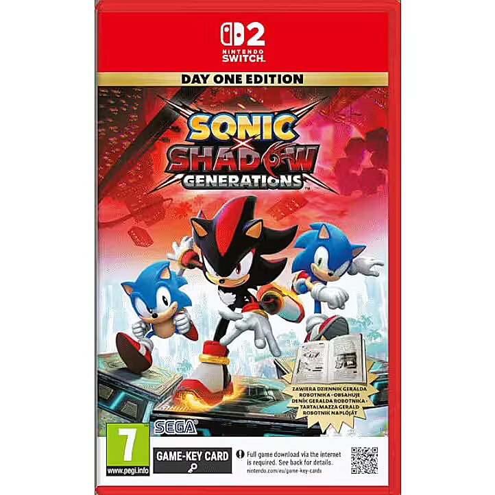 Description - Fizyczny nośnik nie zawiera gry. Aby korzystać z gry, należy ją pobrać. Pobieranie wymaga połączenia z internetem i wystarczającej ilości wolnego miejsca na konsoli lub karcie pamięci microSD Express (sprzedawana osobno). Po pobraniu gry możliwe jest korzystanie z niej bez połączenia z internetem. Aby móc korzystać z gry karta Game-Key Card musi cały czas znajdować się w konsoli. Więcej informacji: https://www.nintendo.com/en-gb/Hardware/Nintendo-Switch-2/Nintendo-Switch-2-Game-Key-Cards-2785635.html Pudełkowe wydanie zawiera 28-stronicowy dziennik Geralda Robotnika, w którym profesor zapisywał swoje najskrytsze myśli i sporządzał rysunki podczas pracy nad Shadowem the Hedgehogiem oraz stacją kosmiczną ARK. Shadow the Hedgehog powraca razem z klasycznym oraz współczesnym Sonikiem w SONIC X SHADOW GENERATIONS nowej kolekcji oferującej dwa zróżnicowane style rozgrywki! Graj jako Shadow w nowej kampanii fabularnej z niespotykanymi dotąd zdolnościami, które dowodzą, dlaczego jest on znany jako ostateczna forma życia! Pędź przez najważniejsze etapy historii Shadowa, odkryj sekrety ukryte w rozległym, centralnym świecie i odblokuj nowe moce, aby pokonać Black Dooma i ocalić świat. SONIC X SHADOW GENERATIONS zawiera także w pełni remasterowaną wersję hitowej gry SONIC GENERATIONS podróży w czasie poprzez kultowe etapy 3D i 2D Sonica z ulepszoną grafiką i nową bonusową zawartością.