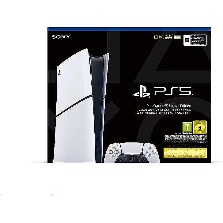 LongSummaryDescription - Sony PlayStation 5 (model group - Slim) Digital Edition. Platform: PlayStation 5, Product colour: Black, White, Internal memory: 16384 MB. Storage media: SSD, Internal storage capacity: 1.02 TB, Read speed: 5500 MB/s. Ethernet LAN data rates: 10,100,1000 Mbit/s, Ethernet interface type: Gigabit Ethernet, Wi-Fi standards: 802.11a, 802.11b, 802.11g, Wi-Fi 4 (802.11n), Wi-Fi 5 (802.11ac), Wi-Fi 6 (802.11ax). HD type: 8K Ultra HD, Supported video modes: 2160p, 4320p, Audio decoders: DTS, DTS 2.0, DTS 5.1, DTS-HD, DTS-HD Master Audio 5.1, Dolby Digital 5.1, Dolby Digital Plus,.... Package width: 431 mm, Package depth: 1131 mm, Package height: 359 mm