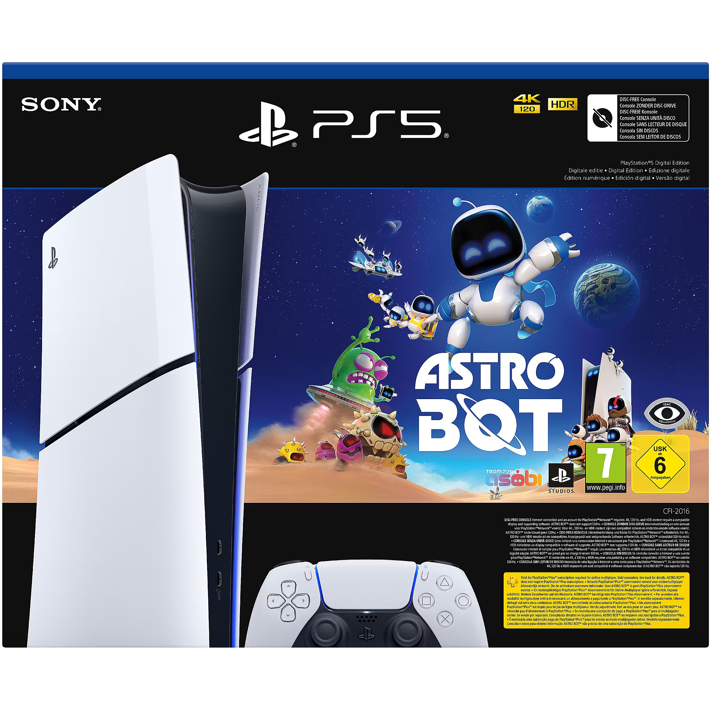 LongSummaryDescription - Sony PlayStation 5 Digital Edition Slim Astro Bot. Platform: PlayStation 5, Product colour: Black, White, Internal memory: 16384 MB. Storage media: SSD, Internal storage capacity: 1 TB. Ethernet LAN data rates: 10,100,1000 Mbit/s, Ethernet interface type: Gigabit Ethernet, Wi-Fi standards: 802.11a, 802.11b, 802.11g, Wi-Fi 4 (802.11n), Wi-Fi 5 (802.11ac), Wi-Fi 6 (802.11ax). Supported video modes: 2160p, 4320p. Package width: 431 mm, Package depth: 131 mm, Package height: 359 mm