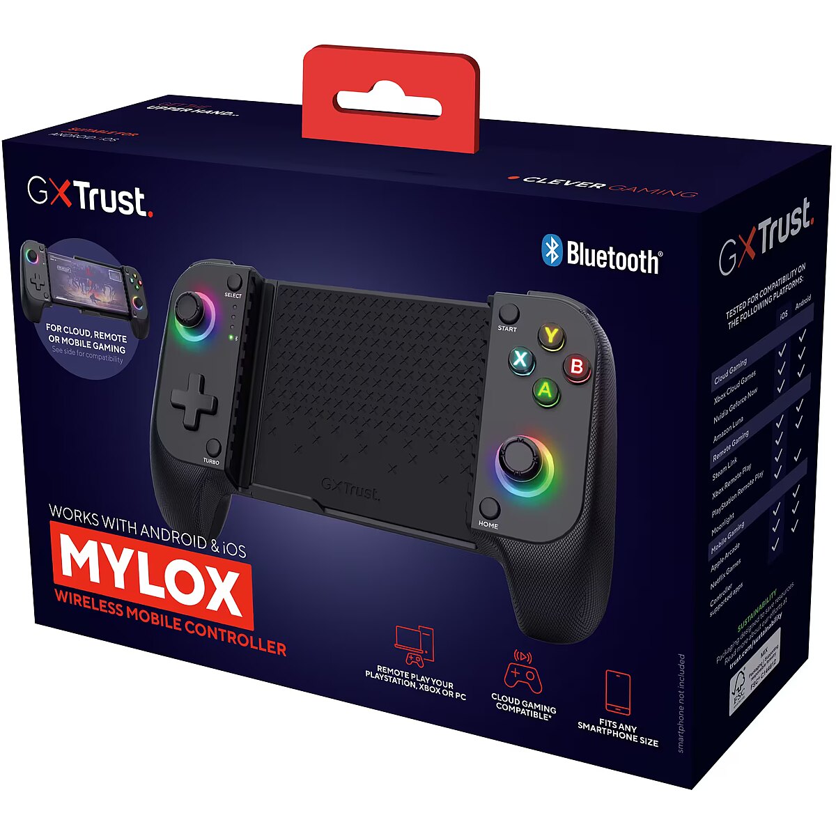 LongDesc - Game anytime, anywhereTake your gaming on the go with the Mylox Bluetooth Mobile Gaming Controller. With a low-latency Bluetooth® 5.0 connection compatible with both iPhone and Android smartphones, it’s your perfect companion for mobile, remote, and on-the-go gaming.Three ways to playGet thrice the fun with this controller. Whether you want to play controller-friendly iOS and Android games, stream your favourite PlayStation and Xbox titles directly to your phone*, or dive into the next level of cloud PC gaming, this controller can do it all! *Remote play app needed, PlayStation only available for iOSGet in the gameThere’s nothing better than feeling totally immersed in your game, which is why the Mylox has been designed with dual vibration feedback for a realistic gaming experience. What’s more, RGB LED-lit buttons add a colourful and dynamic vibe to every gaming session for even more fun.Around the clockKeep the game going all day with the Mylox controller’s built-in rechargeable battery. Offering up to 12 hours of uninterrupted playtime, it ensures you stay in the action as long as you want. Play on, gamer!Fun for all phonesDesigned for compatibility, the Mylox fits all phone sizes. Its durable rubberised, spring-loaded phone clamp keeps your device safe and secure, allowing you to enjoy a comfortable handheld console-style experience.