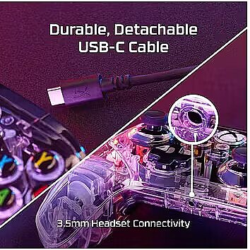 LongSummaryDescription - HyperX Clutch Gladiate - Wired Gaming RGB Controller - Xbox. Device type: Gamepad, Gaming platforms supported: Xbox One, Xbox Series X. Connectivity technology: Wired, Device interface: USB, USB connector type: USB Type-A, USB Type-C. Product colour: Transparent, Cable length: 2.95 m. Power source: Cable/Battery, Battery type: Built-in. Width: 155 mm, Depth: 111 mm, Height: 65 mm
