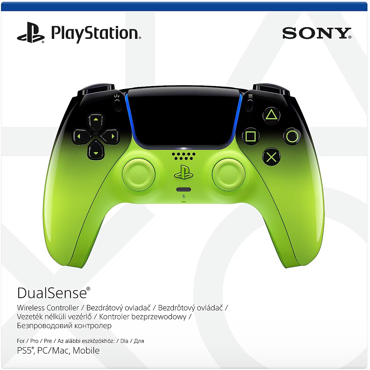 LongSummaryDescription - Sony DualSense. Device type: Gamepad, Gaming platforms supported: PlayStation 5, Gaming control function buttons: D-pad, Menu button, Microphone mute button. Connectivity technology: Wired & Wireless, Device interface: Bluetooth/USB, USB connector type: USB Type-C. Product colour: Black, Green. Power source: Battery. Width: 188 mm, Depth: 69 mm, Height: 189 mm