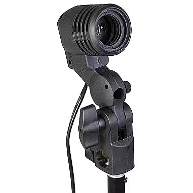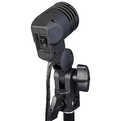 description_en - With this lightweight plastic socket with E27 thread and adjustable tilt, you can easily align the light optimally - in combination with a daylight lamp or a suitable flash bulb. The frame also has a holder for studio umbrellas. Especially beginners in creative studio lighting can easily create great highlights. A holding option on the lamp holder on the spigot adapter of light stands makes attachment very easy. A 3 m connection cable gives you a very large radius of action. The toggle switch on the back of the socket allows the light source to be switched on and off quickly. The socket has a maximum load capacity of 60 W power consumption. Universal lamp holder E27 socket Integrated umbrella holder Comfortable switch 3 m power cord