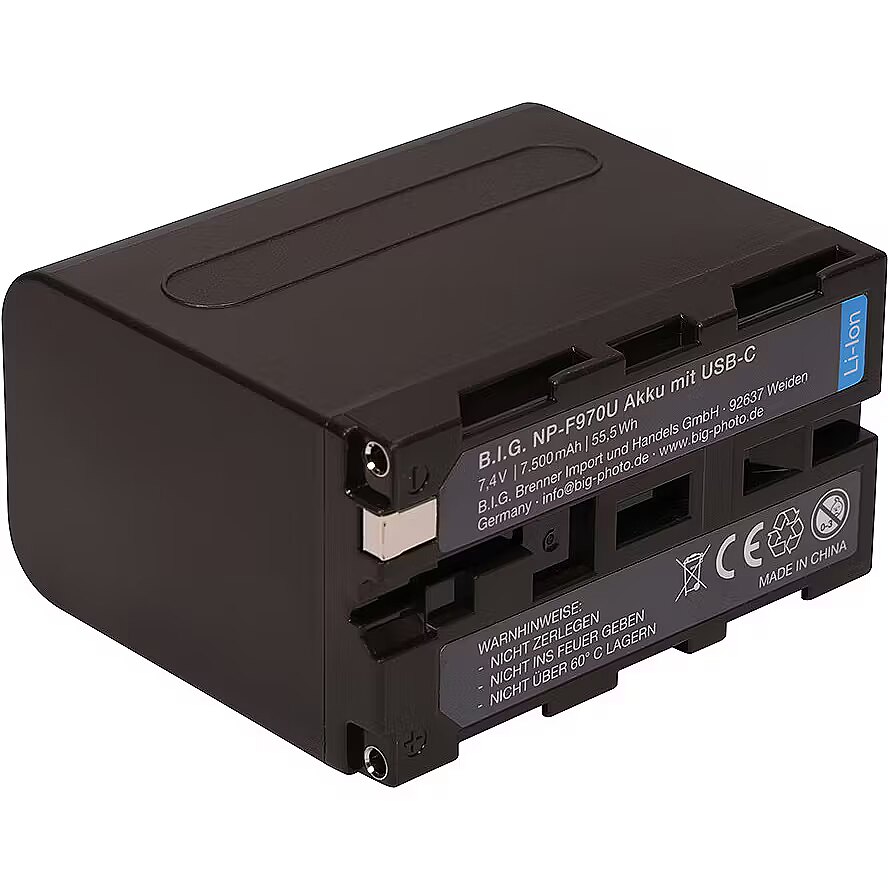 description_en - The BIG NP-F970U battery is suitable for LED lights and other video accessories that use Sony NP-F batteries. The battery also has a USB-C port, which allows you to charge it not only with a classic battery charger, but also on the go with a power bank or USB power adapter. A USB-A to USB-C cable is included. Battery type: Sony NP-F970U Capacity: 7500 mAh / 55,5 Wh Voltage: 7.4 V Weight: 350 g