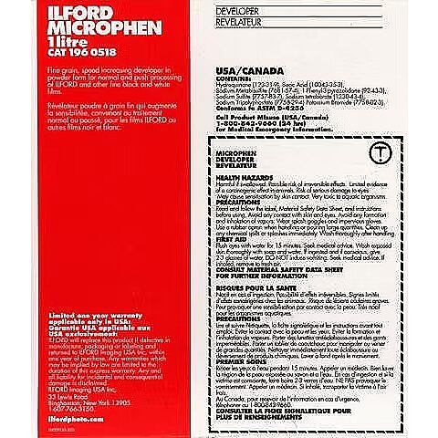 description_en - ILFORD MICROPHEN is a fine grain film developer which gives an effective increase in film speed. A speed increase of up to half a stop can be achieved with most films but with faster films such as HP5 Plus, Delta 400 Professional and Delta 3200 Professional it is more. Many developers that give an increase in film speed usually produce a corresponding increase in grain size, MICROPHEN is formulated to overcome this disadvantage, the low alkalinity of the developer reduces grain size and grain clumping. Therefore, MICROPHEN is said to have a high speed/grain ratio, i.e. it gives a speed increase while retaining much of the grain characteristics associated with fine grain developers. MICROPHEN is particularly useful when using extended development times to push process fast films such as HP5 Plus, Delta 400 Professional, Delta 3200 Professional and SFX200. Film developer powder For developing black and white films Maintains the film's characteristic fine grain Can be used as a stock solution, 1 : 1 or 1 : 3 1000 ml