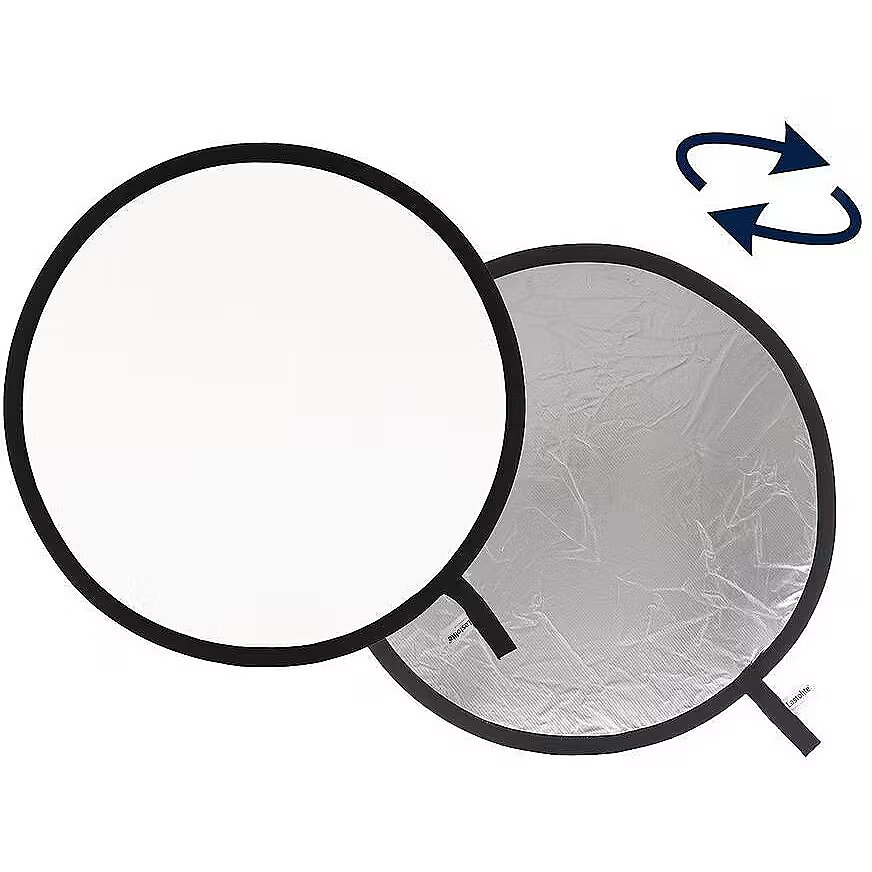 description_short_en - Double sided reflector Silver and white side Convenient and practical folding design Diameter: 50 cm