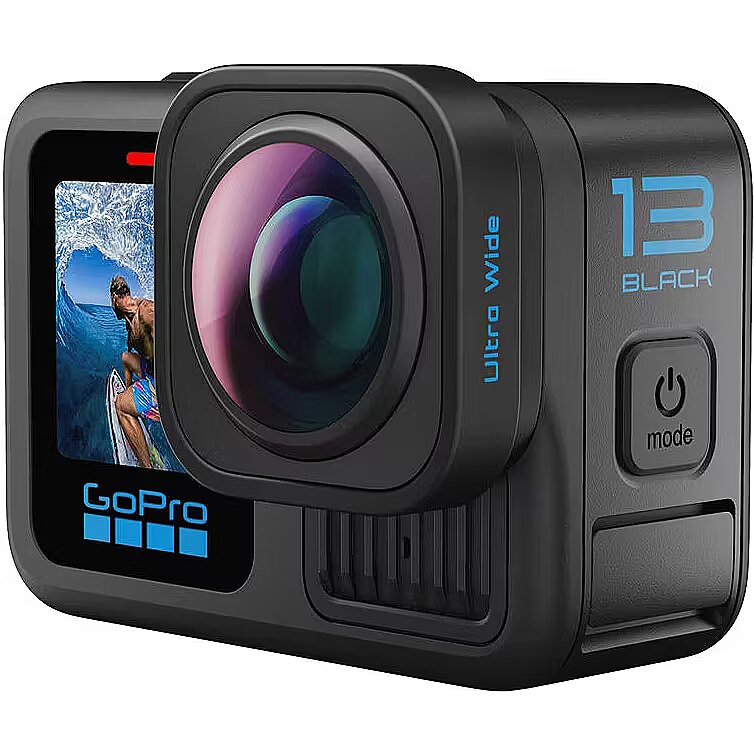 HB series lenses with Auto Detection function¹ The new HB series lenses give the HERO13 Black camera creative, specific features. The Ultra Wide Lens Mod wide-angle lens is perfect for ultra-inclusive POV shots and landscapes. The Macro Lens Mod close-up lens gives GoPro an unprecedented ability to shoot focused close-ups. ND filters add a motion blur effect and allow you to find the perfect amount of light in your shots. The Anamorphic Lens Mod helps professional cinematographers achieve Hollywood-worthy results. HERO13 Black recognizes the type of lens or filter attached and automatically adjusts filming settings.