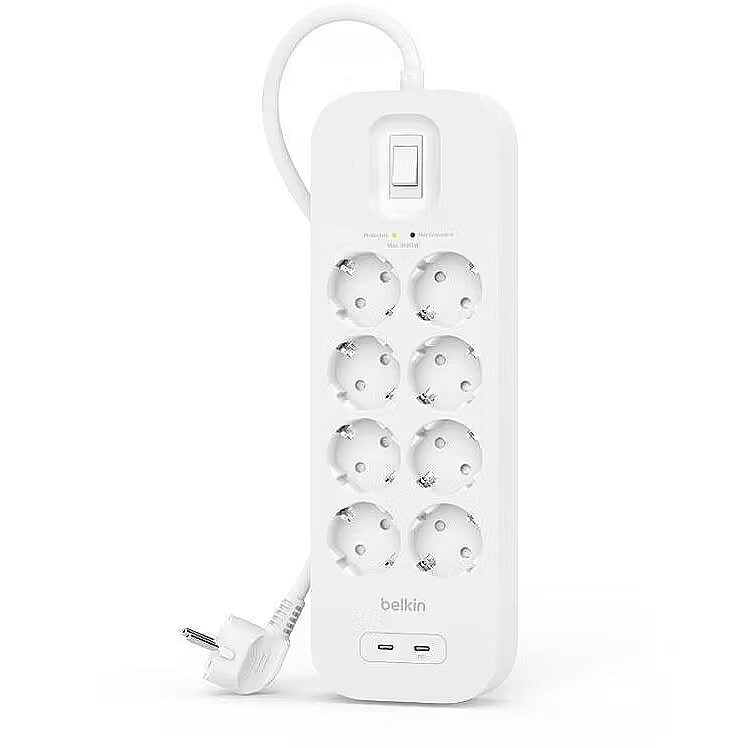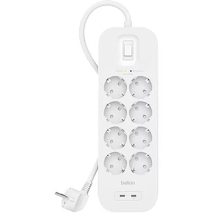Description - Surge protection with USB-C ports (8 slots and USB-C ports) SurgePlus Extend the life of your electronics and equipment with 900J surge protection, featuring eight AC outlets and USB-C ports. Benefits of using the product: 900 J of surge protection Fast charging via USB-C PD Dynamic PPS technology for smarter charging Two USB-C ports USB-C charging with a maximum power of 30 W Extends the durability of electronic devices More intelligent and safe design 2 m power cord Mounting holes on the back allow for easy installation to save space on floors and countertops Protection indicators let you know that devices are safe Compatible with AC sockets, USB-C PD ports 2-year warranty Belkin SurgePlus product family SurgePlus protects connected devices against damage resulting from voltage fluctuations and overvoltages caused by, among others, by lightning or power failures. Surge protection helps you avoid costly repairs and the loss of valuable data in the event of a power surge, and extends the life of your devices by blocking smaller fluctuations for a longer period of time. Connected equipment insurance provides additional protection and peace of mind. Features of the Belkin SurgePlus product family Three-way protection (phase, neutral, ground) Multiple secured sockets The Belkin Difference approach A pioneer in innovation and technology for 40 years The #1 third-party manufacturer of wireless charging accessories