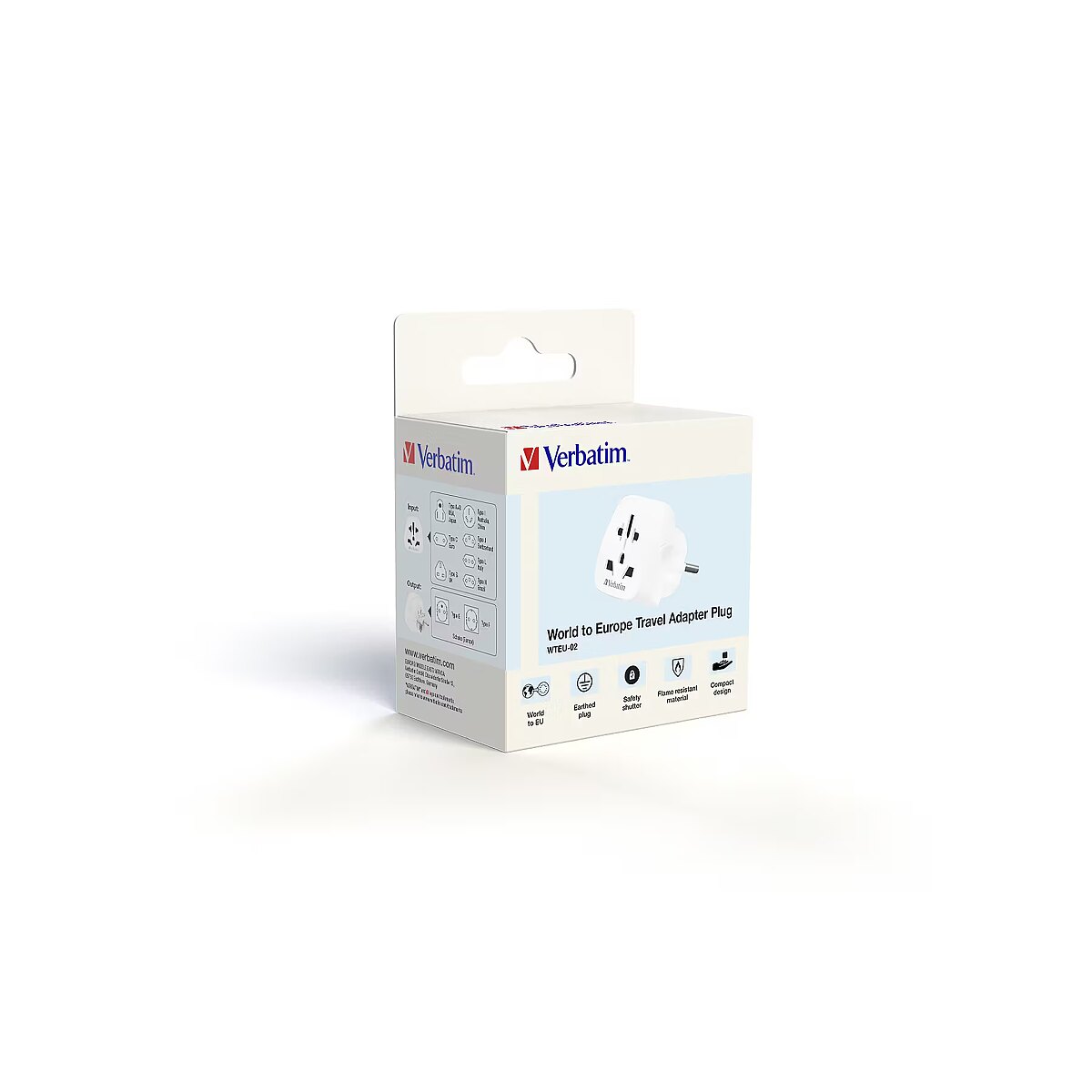 LongDesc - EU Plug AdapterYour ideal travel companion in Europe – this master plug travel adapter converts plug types from around the world (UK, USA/Japan, Australia/China, Italy, Switzerland, Brazil and many more) to a regular European 2-pin mains plug.The design of the Verbatim World to Europe Travel Adapter Plug ensures that it fits firmly into wall sockets and will not fall out. Its small and compact size makes it convenient to take with you across Europe. System RequirementsPlug types accepted by the adapter:- Type A, Type B, Type C, Type G, Type I, Type J, Type L, Type NOutlets the travel adapter can plug into:- Type E, Type F (Schuko)