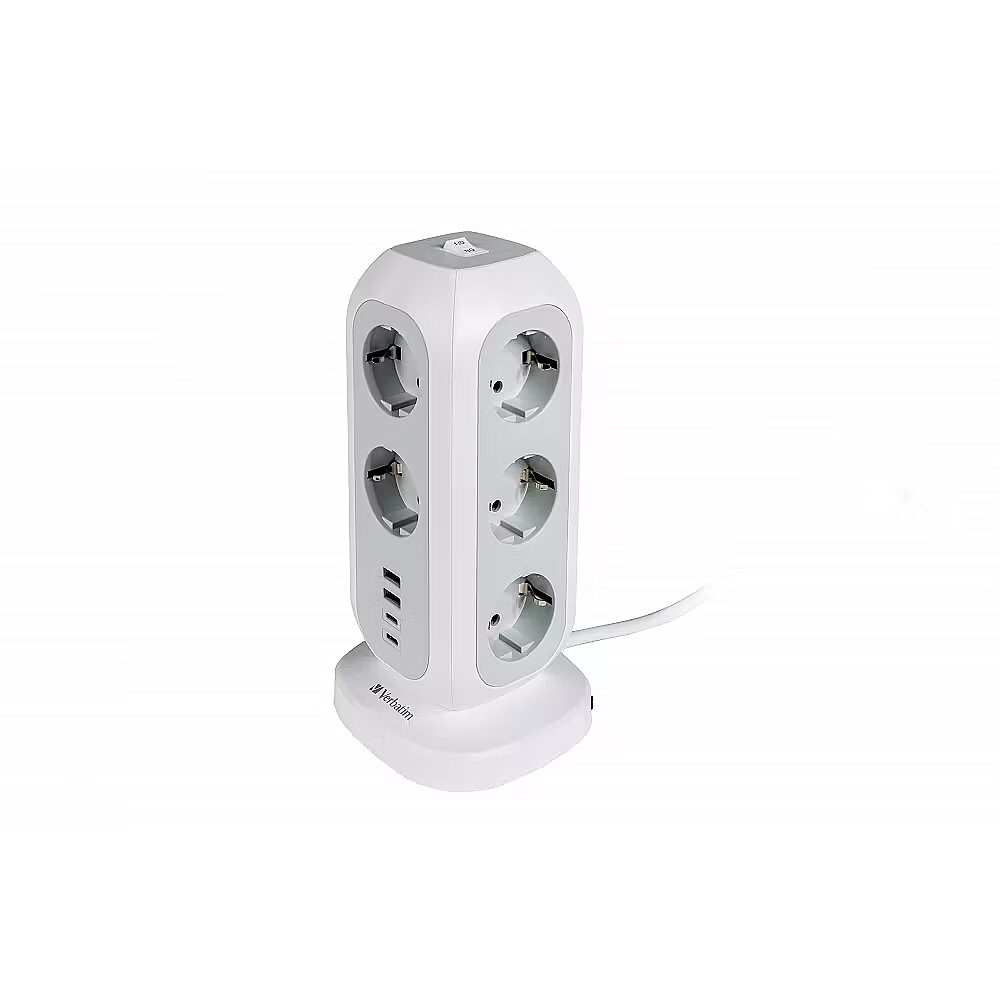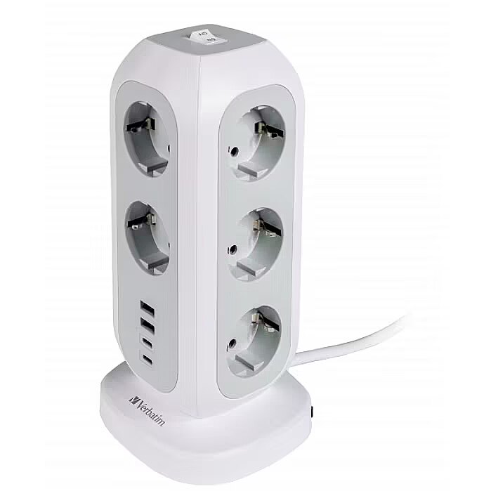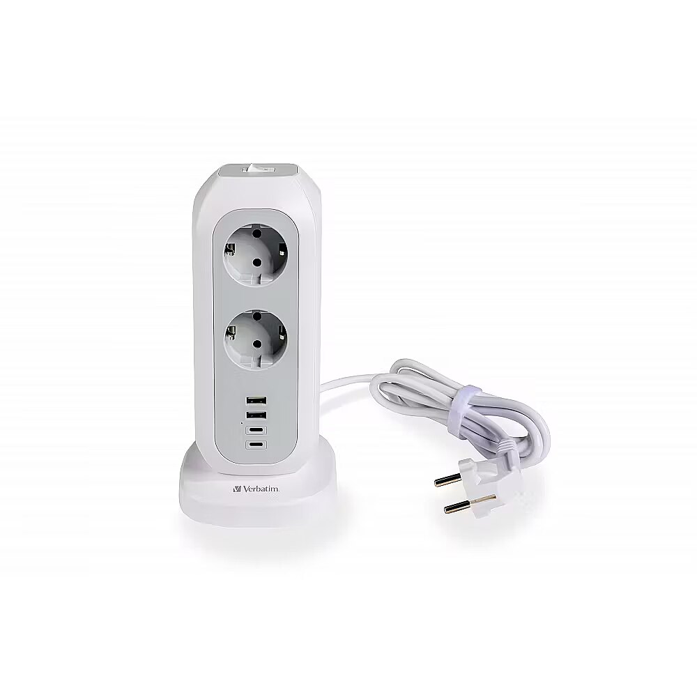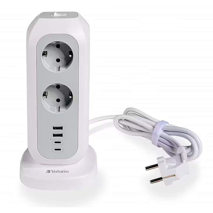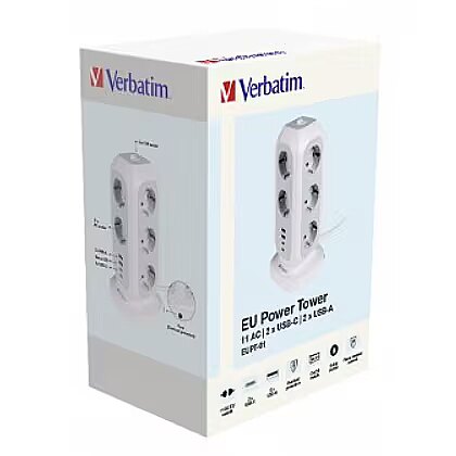 LongDesc - The Verbatim EU Power Tower can extend one European socket to 11 AC sockets plus two USB-C ports and two USB-A ports. This multiplug tower with its 2m extension cable provides all the sockets you need to keep your devices charged and working on full power.Compact & Convenient Multiplug TowerThe space-saving vertical design makes the Verbatim EU Power Tower ideal for home, kitchen, office, or school providing a neat and tidy desk surfaces or floor space.The on/off switch on top of the tower controls the whole power tower allowing you to switch off all devices in one go when not in use to save energy.Multiple protectionCertified by CE and ROHS, and made with high quality fireproof polycarbonate material, the EU Power Tower has safety shutters for child protection that can only be opened with force of more than 75N (7.5Kg) per hole. It is also equipped with overload protection to provide safety when used for high rated household appliances or electric devices. It automatically switches off when the current input from the socket exceeds 16A or the sockets used require more than 3600W.