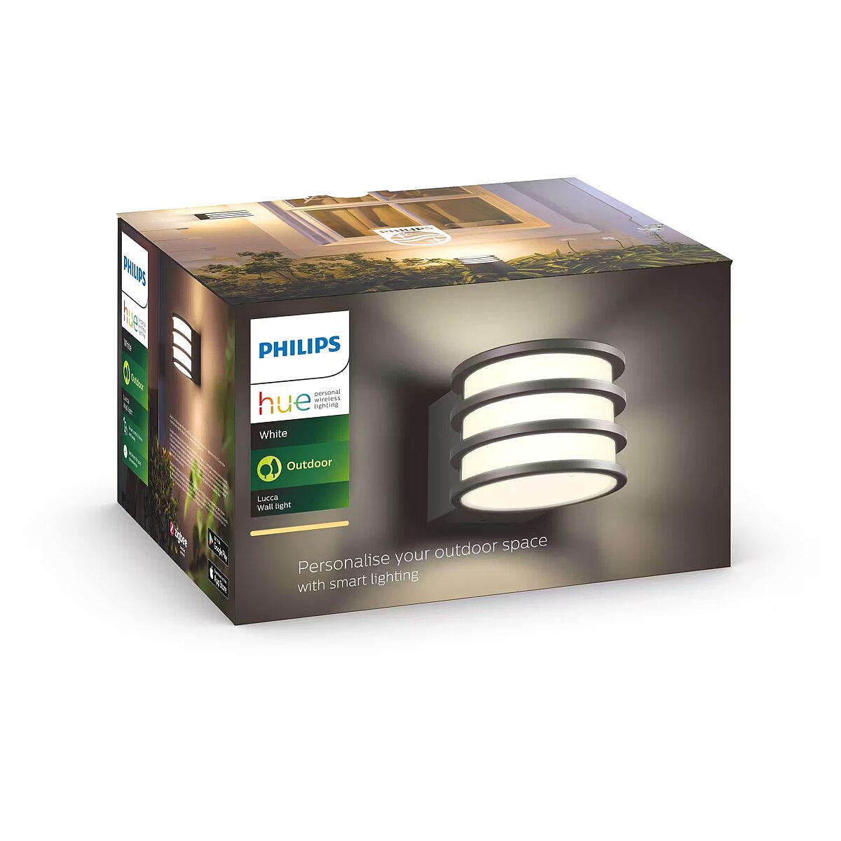 LongSummaryDescription - Philips Hue White Lucca Outdoor wall light. Type: Smart wall light, Product colour: Anthracite, Bulb type: LED. Energy efficiency class: F, Input voltage: 220 - 240 Aralığı, Bulb voltage: 230 V. Width: 170 mm, Depth: 215 mm, Height: 115 mm. Package dimensions (WxDxH): 19 x 23.5 x 14 mm, Package width: 235 mm, Package depth: 235 mm. Compatible bulb energy efficiency classes (old): A++, B, C, D, E, Included bulb energy efficiency class (old): A+