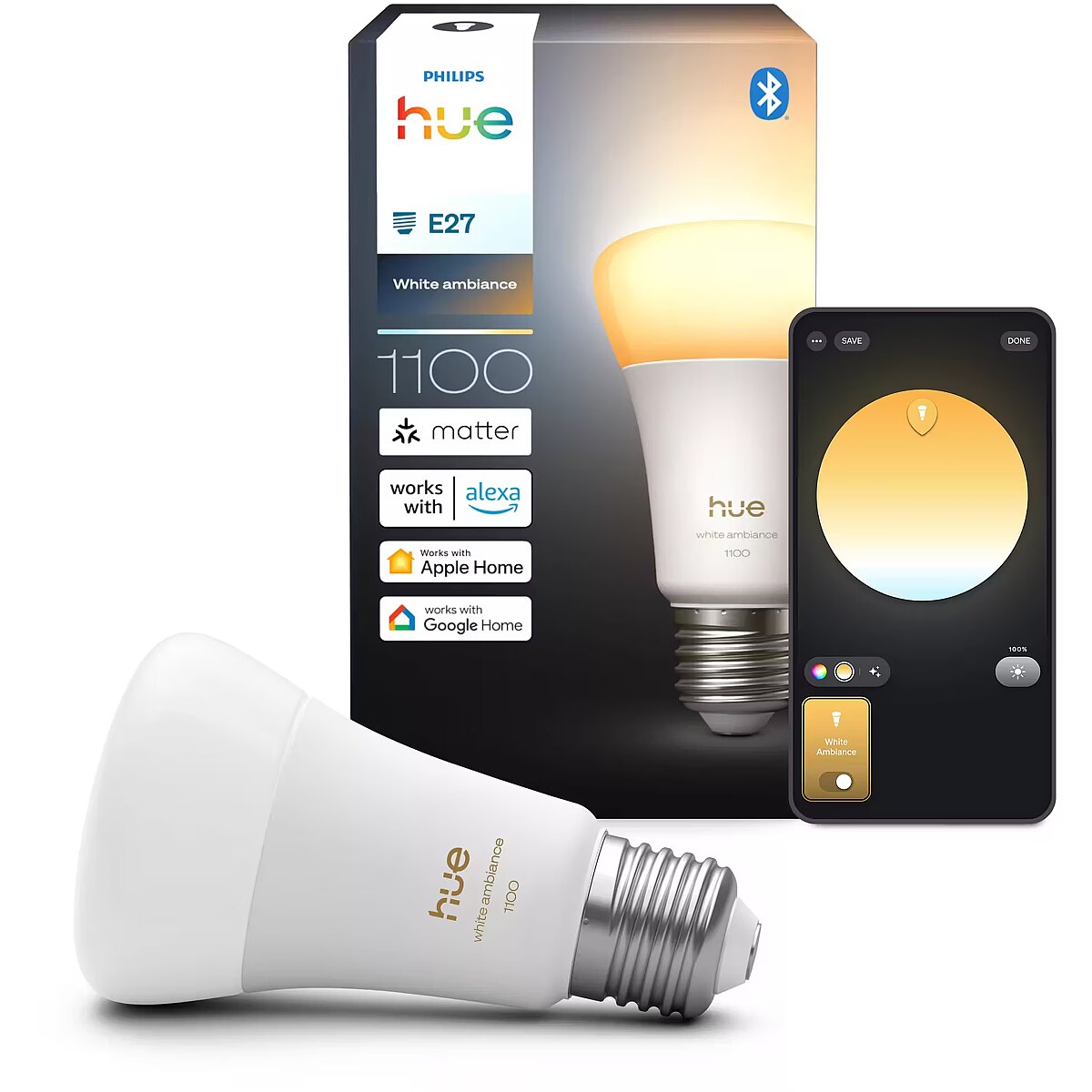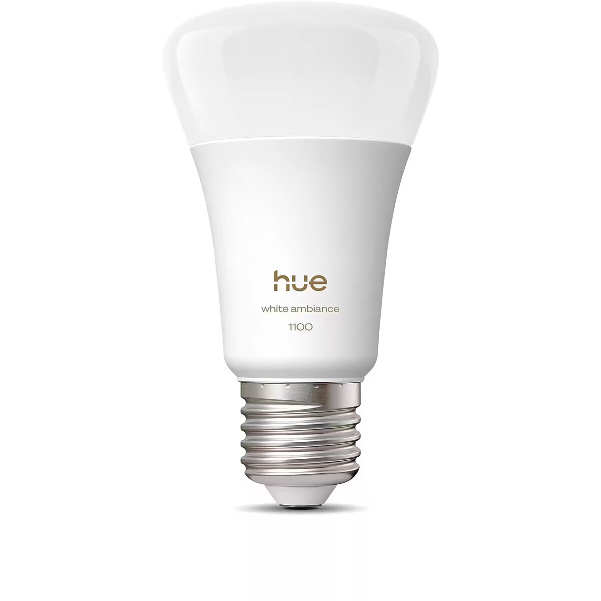 LongDescription EN - Bring natural daylight into your homeThe Philips Hue White Ambiance A60 E27 delivers full-spectrum white light designed to support your daily routine. From warm candlelight tones to crisp, energising white light, one bulb adapts to every moment of the day. Wide colour temperature rangeWith adjustable white light from 1,000 to 20,000 K, you can tailor your lighting for productivity, relaxation, or gentle night lighting. Ultra-low dimming for perfect ambienceDimming down to just 0.2% brightness allows you to create soft, subtle lighting that’s ideal for evenings and nighttime use. Easy control via app or voiceUsing the Philips Hue Bluetooth app, you can control up to 10 lights in a single room. The bulb also supports voice control through assistants such as Google Assistant and Amazon Alexa. Unlock full smart lighting with Hue BridgeAdd a Hue Bridge to access advanced features like remote control, automations, schedules, and whole-home smart lighting experiences.