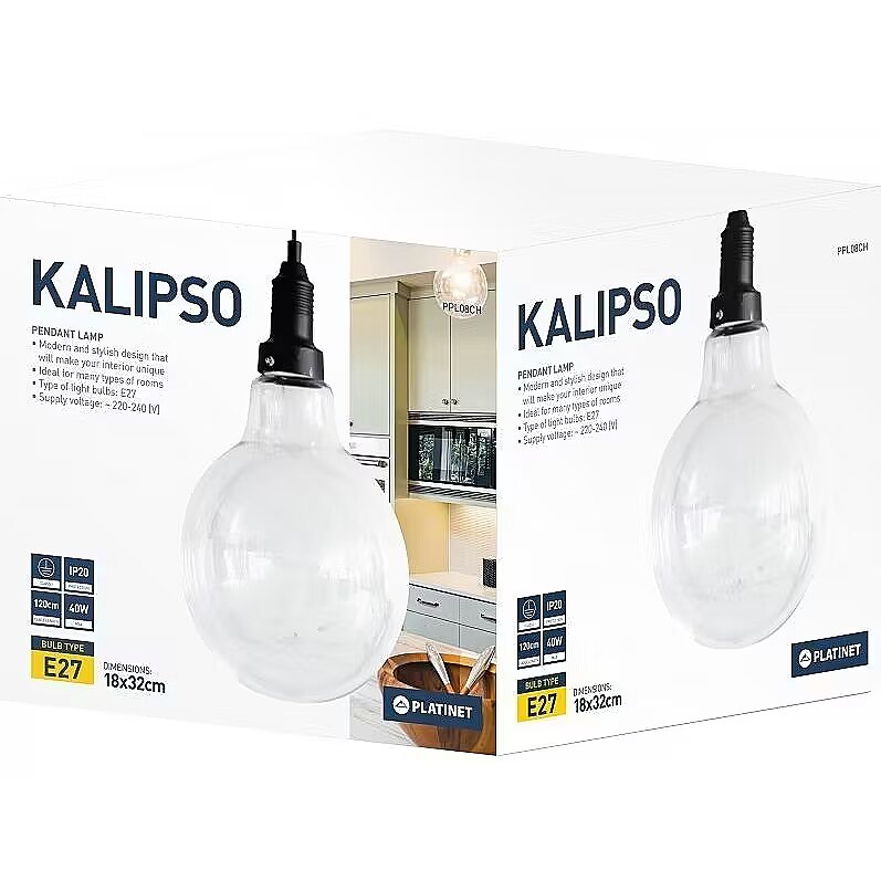 description_en - Platinet Kalipso is a high-quality pendant lamp with a modern and stylish design that will give your interior a unique look. Fits perfectly into your living room, kids room, dining areas, kitchen or office spaces. With its unique design, it blends perfectly into both modern and classic interiors. Uses E27 light bulbs – max 40 W Voltage: 220–240 V Made of metal & glass Dimensions: 18 × 32 cm Cable length: 120 cm