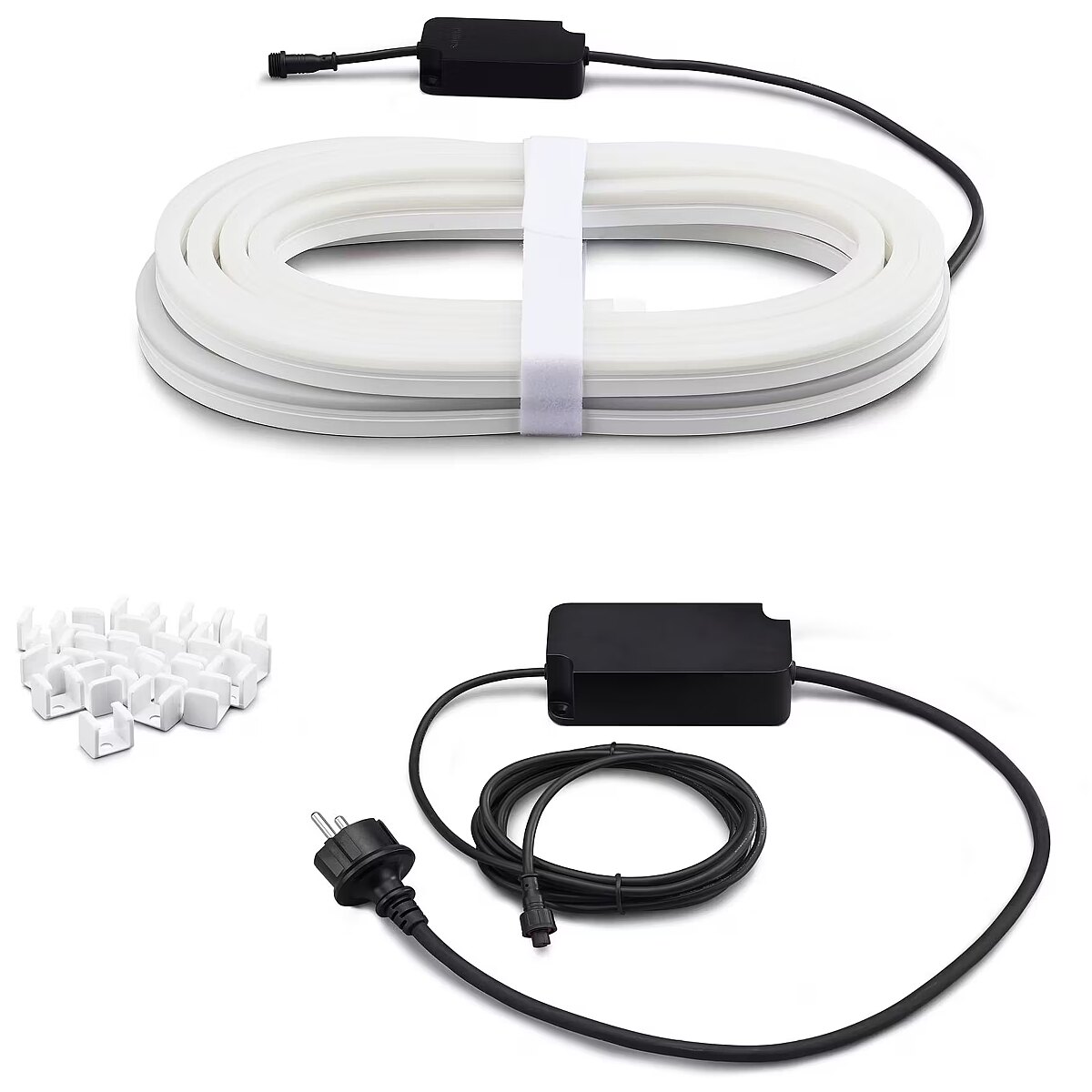 The Philips Hue outdoor light strip has a special coating that diffuses the emitted white or colored light. There's no need to hide the light strip, whether you're using it for direct or indirect lighting, as only the pure light is visible. Power supply and plug are included
