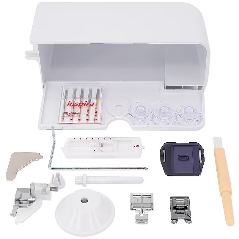 Packaging content - Sewing machine accessories included - Satin stitch foot