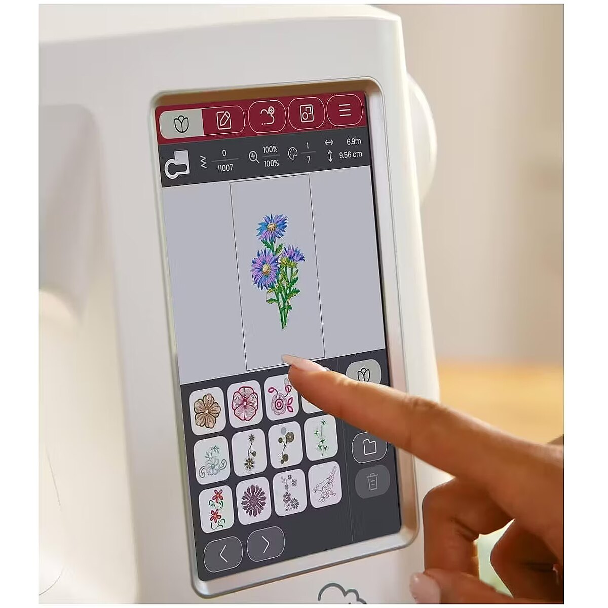 Dane techniczne: Wyposażenie - 6 stopek dociskowych | stopka do 1-stopniowego obszywania dziurek na guziki | tamborek 170 x 100 mm