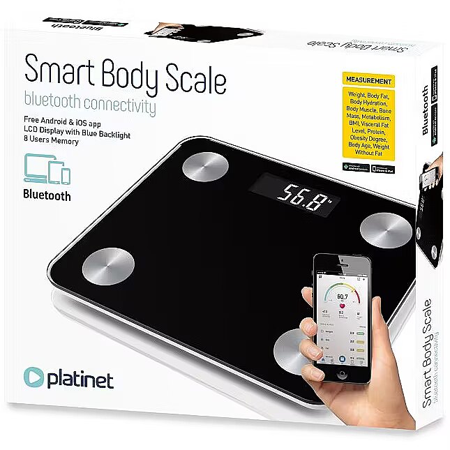 The Platinet smart scale does body composition analysis: weight, body fat, hydration, muscle mass, bone mass, metabolism, BMI, visceral fat, protein, obesity degree, body age, weight without fat. Synchronize with your smartphone and look up your info on the Android or iOS app but it can also be used independently without using a smartphones. The scale has memory for up to 8 people.