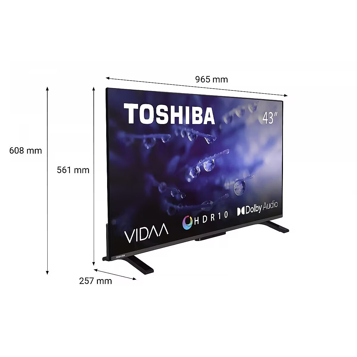 Description - 43LV2E63DG VIDAA VIDAA provides its users with the best global and local content while ensuring the ease of use of the product! Full HD Discover excellent quality images on the Toshiba Full HD TV screen. With a 1080p resolution screen, you can enjoy perfectly sharp image clarity along with the finest details and vivid colors. Dolby Audio Experience the type of sound you would normally only hear in the cinema. Enjoy authentic-sounding dialogue and hear more of the action on screen with Dolby Audio. DTS Virtual It facilitates the expansion of surround sound listening, ensuring primarily the perception of high channels, without the need to use additional speakers. DTS acquires 3D ambient sounds natively without any 2D to 3D audio conversion process. Disney+ Everything you need to know about Disney+. Here you'll find the greatest stories from Disney, Pixar, Marvel, Star Wars, National Geographic and Star. Discover even more reasons to love Disney+. Netflix Discover the Netflix button on your remote to take you from one adventure to the next. PrimeVideo Satisfy your appetite for high-quality entertainment in the comfort of your home. Enjoy countless movies and series, as well as award-winning Prime Originals. YouTube See what the world is watching right now - from the hottest music videos to popular games, movies, shows, news, science, fitness and more.