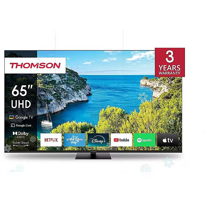 Description - Enjoy the cinematic viewing quality of the Thomson Google TV 65" UHD. Google TV simplifies your entertainment experience by organizing content from your apps and subscriptions. Create multiple user profiles and benefit from curated recommendations. Enjoy a wide range of smart features, such as access to 400,000+ movies and TV shows, smart voice control with Google Assistant, and Google Cast to stream content from compatible smart devices to your TV. Immerse yourself in crystal clear 4K UHD image quality, that captures every detail with its four times higher resolution than Full HD. HDR10 technology enhances every scene with rich contrasts and balanced brightness, ensuring precise color reproduction and lifelike picture quality. The ergonomic remote control with smooth backlighting allows you to keep an eye on everything, even in dim lighting. And the integrated Google Assistant enables you to intuitively control your TV with voice commands. Search for your favorite movies, ask for recommendations based on your mood, or control compatible smart devices - all with the convenience of your voice. Benefit from increased placement flexibility with the central swivel stand and enhance your viewing experience. The innovative design enables you to effortlessly rotate your TV by up to 30 degrees, allowing you to find the perfect angle for your entertainment setup. The built-in triple tuner allows reception via satellite-antenna, terrestrial antenna or cable. So, you can receive all available channels without additional hardware.