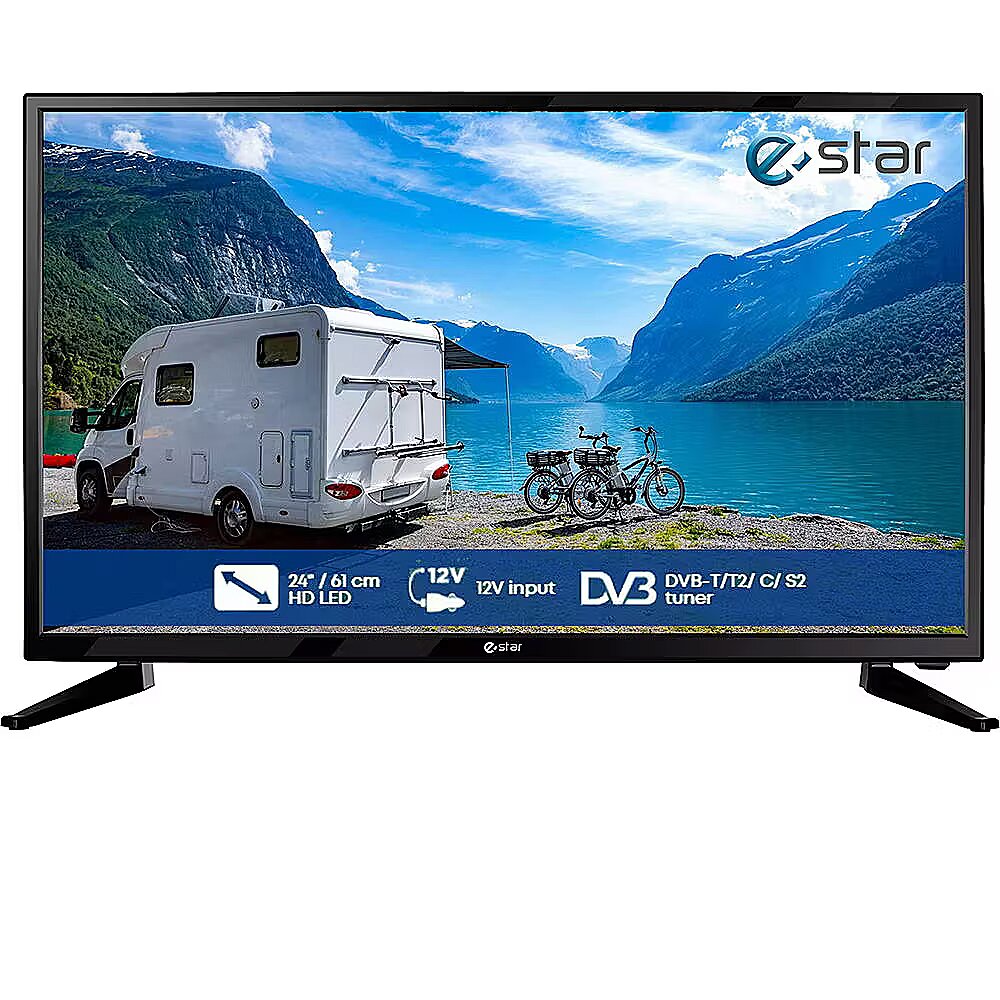MediumDescription EN - eSTAR LED TV 24R2T2 is a compact 24-inch TV ideal for cars, campers, or summer houses. With 12 V input and HD resolution, it offers clear picture quality and mobile-friendly functionality.