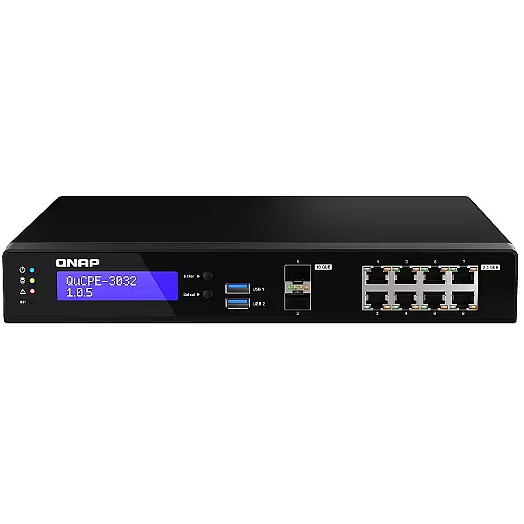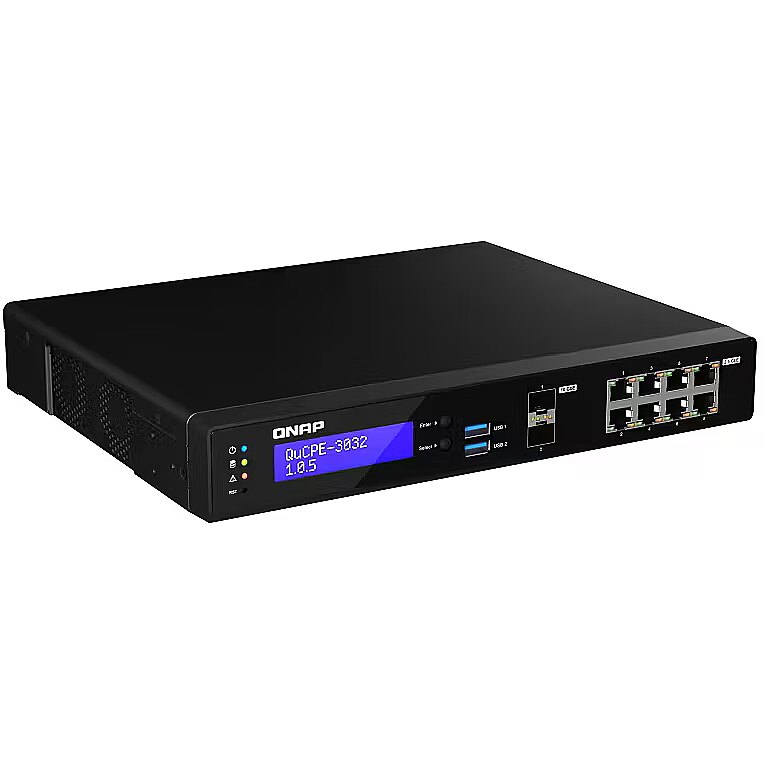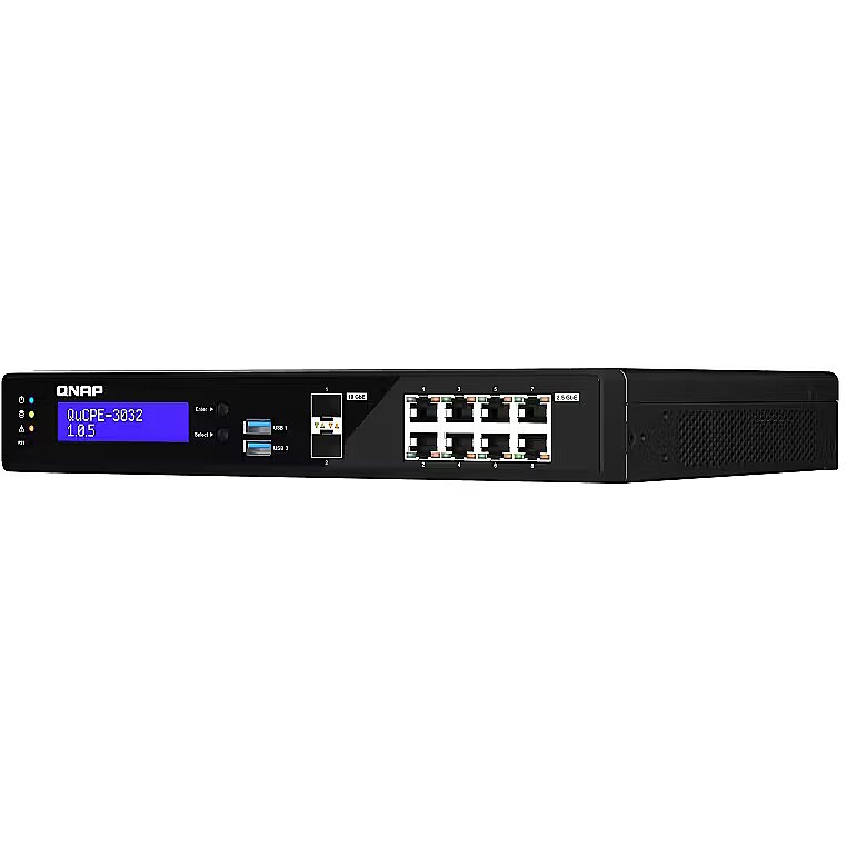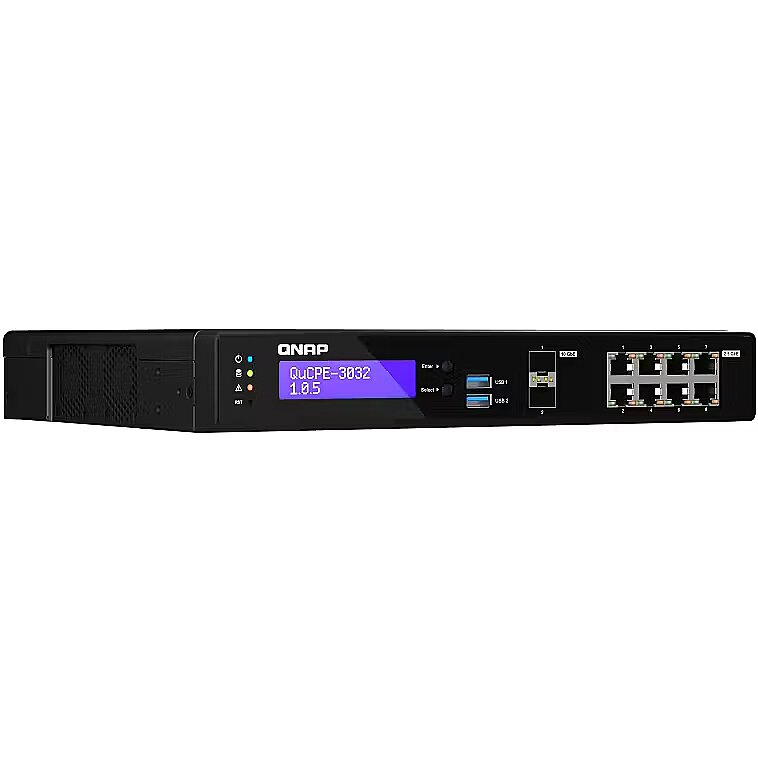 LongDesc - Network Virtualization Premise Equipment with an Intel® Atom Refresh quad-core processor, suitable for deploying virtual networks in multiple edge officesQNAP’s QuCPE-3032 Network Virtualization Premise Equipment is a universal virtualization platform specifically designed for SMBs. The QuCPE-3032 adopts the high-performance Intel® Atom Refresh quad-core processor that supports Intel® QAT, Smart NIC SR-IOV and DPDK hardware acceleration technologies while also providing eight 2.5GbE RJ45 ports and two 10GbE SFP+ ports. With enhanced bandwidth and computing performance for running VNFs and connecting SD-WAN (Supporting VPN/WireGuard), the QuCPE-3032 is suitable for multi-user and multi-tasking business applications. The QuCPE-3032 also features the QNE (QNAP Network Equipment) OS for chaining VNF services and AMIZ Cloud centralized deployment and management platform to realize flexible Zero Touch Provisioning.Build a multi-site network infrastructure for SMBs and Micro-enterprisesQNAP’s high-performance QuCPE integrates the QuWAN SD-WAN solution, AMIZ Cloud platform, and WireGuard VPN. Small businesses and micro-enterprises can flexibly build multi-site network infrastructure by deploying a QuCPE Series 7 in their headquarters, and QuCPE Series 3 in their branches and workplaces.Easily deploy virtual network environments with the 2-in-1 Premise EquipmentWhen deploying virtualized environments, Enterprises often choose to install costly enterprise-grade solutions on edge servers or free solutions with limited technical support – a hard decision for resource-constricted SMBs. In addition, simultaneously running multiple VMs can impact network performance. QNAP’s QuCPE Network Virtualization Premise Equipment combines hardware acceleration technologies, QNAP’s proprietary QNE Network operating system and the AMIZ Cloud centralized management platform to help SMBs build a highly-optimized virtual network infrastructure.The QNE Network Operating System completes your virtual network infrastructureQNAP’s proprietary QNE Network operating system supports the intuitive Network Service Composer and Software-Defined WAN (SD-WAN), allowing for flexible network deployment and multi-site network infrastructure expansion. By supporting Virtual Network Functions (VNF), Virtual Machines and Containers, QNE Network integrates network, computing, and application services to realize network virtualization, application virtualization and efficient management, greatly lowering management and maintenance complexity.AMIZ Cloud - powerful centralized VM management platformThe AMIZ Cloud centralized management platform enables HQ-based IT staff to centrally monitor all edge devices, virtual machines, and containers. Supporting troubleshooting, and remote management via the Account Center, the QuCPE-3032 helps enterprises achieve Zero Touch Provisioning, thus enhancing IT deployment efficiency and reducing maintenance costs.Efficient management via Service Composer with visualized topologyWith the visualized topology of the Network Service Composer, you can easily set up VNFs or VMs, create virtual switches, and allocate physical network resources for chained services by drag and drop. When settings change, you can directly add/remove individual VNFs using the service composer, greatly simplifying operational network combination.SD-WAN enables chaining network servicesQNE incorporates QNAP’s QuWAN SD-WAN solution (subscription-free) to form encrypted VPN tunnels with other QNAP devices based in multiple sites and achieve multi-site network services chaining. For example, you can automatically create a firewall network (using QuWAN and pfSense VNFs) to enhance WAN security in the Service Composer UI using drag-and-drop.Optimize LAN/WAN performanceService Composer also supports SR-IOV and QuWAN SD-WAN, which greatly improves the WAN transmission of the QuCPE-3032 that runs QuWAN, while also helping users to enjoy high-speed and secure LAN and WAN network transmission at the same time.Enhanced securityYou can automatically create a firewall network (using QuWAN and pfSense VNFs) to enhance WAN security in the Service Composer UI using drag-and-drop.Run your VM/VNF Directly on QuCPEQNE Network inherits versatile virtual applications from the QNAP QTS system. QuCPE can simultaneously run multiple virtual machines, software containers, and even bespoke user-made virtual machines in Virtualization Station and Container Station, assisting SMBs in improving deployment and management flexibility while streamlining hardware costs.Intel hardware acceleration technologies boost virtual network performanceSpecifically designed for running virtualization applications, the QuCPE-3032 Network Virtualization Premise Equipment adopts multiple Intel hardware acceleration technologies to allow direct hardware access, thus enhancing VM and virtual network transmission performance.DPDK (Data Plane Development Kit)Allows data to bypass the OS Kernel and directly enter user space to offer a double packet transmission rate (Total T/R x L2) and improve overall virtualization application performance.Smart NIC SR-IOV (Single Root I/O Virtualization)By installing an SR-IOV compatible PCIe SmartNIC, you can allocate bandwidth resources from a physical network card directly to VMs. With traffic bypassing the Hypervisor vSwitch, it helps enhance I/O throughout and network efficiency, ensuring reliable VM applications and reduced CPU overheads.Intel QAT (Intel QuickAssist Technology)Offloads computationally-intensive compression and improves IPsec cryptography VPN performance.Smart IT tools for network management efficiencyQNE Network provides comprehensive management features for Smart IT network management.Notification CenterConsolidates QTS system events and alerts, providing a single-app solution for notifications instead of having to configure individual settings in multiple apps. Notifications can be sent through 
