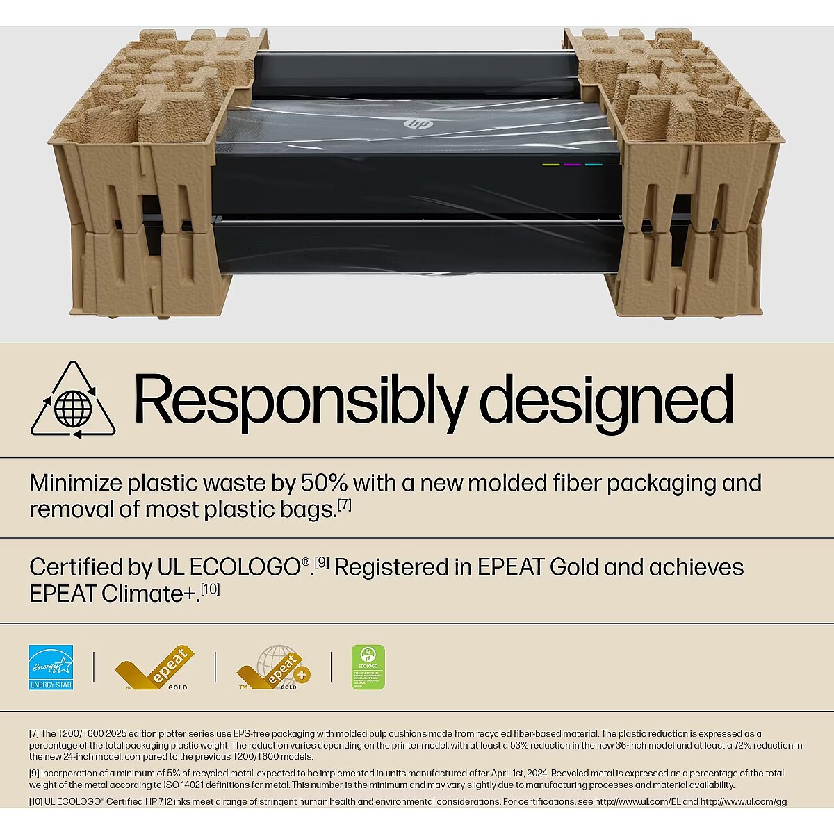 LongDesc - Focus on the project, not your plotter. This printer delivers incredible ease of use with HP Click Print solutions.[2] It's responsibly designed to help you save energy[4] and reduce plastics use[7]. Plus, it’s compact and adaptable—to fit the way you work.Dynamic security enabled printer Certain HP printers are intended to work only with cartridges that have a new or reused HP chip or electronic circuitry. These printers use dynamic security measures to block cartridges using a non-HP chip or electronic circuitry. Periodic firmware updates will maintain the effectiveness of these measures and block cartridges that previously worked. Reused HP chips and electronic circuitry enable the use of reused, remanufactured, and refilled cartridges.