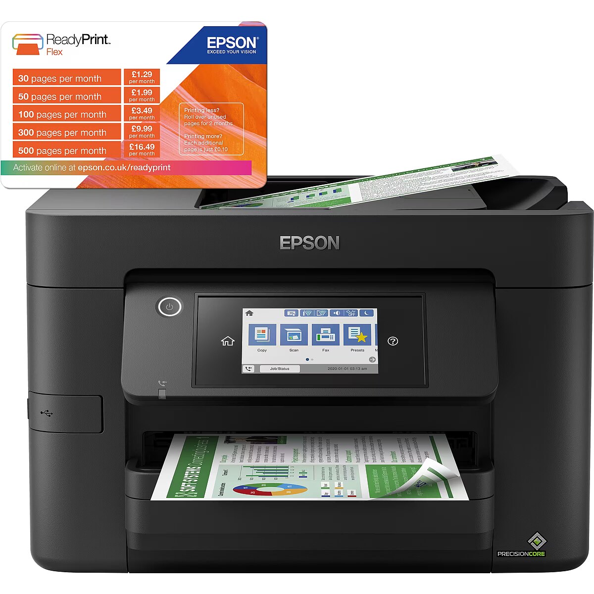LongDesc - Think big with this high-quality multifunction printer with double-sided printing and single scanning and fax all up to A4. You’ll stride through tasks with print speeds of up to 25ppm¹ in black and a 35 page A4 automatic document feeder (ADF). And that’s not forgetting its cost-effective inks and flexible wireless connectivity solutions such as Scan-to-cloud.Professional A4 printingThis A4 multifunction printer will meet the needs of even the most demanding home office and small office users.It offers double-sided (duplex) printing and single scanning and faxing all up to A4, plus its automatic document feeder can process up to 35 double-sided A4 pages. Furthermore, its PrecisionCore printhead produces high-quality, laser-like prints.Minimise your outgoingsDramatically reduce your costs; this printer is compatible with individual inks which are are 50% more efficient compared to tri-colour cartridges³. Giving great value for money, cartridges are available in standard and XL, with the highest yield delivering up to 1,100 pages.Enhance your productivityThis efficient, reliable and fast model offers A4 double-sided printing and print speeds of 25ppm in black and 12ppm in colour¹. It’s also simple to operate directly thanks to its intuitive user interface and 10.9cm touchscreen.Flexible wireless solutionsPrint from anywhere in the office with Wi-Fi connectivity or use Wi-Fi Direct to print from compatible wireless devices without a Wi-Fi network. Epson's free mobile printing apps and solutions provide further versatility; Email Print allows you to send items to print from almost anywhere in the world². And with Scan-to-Cloud, you can enjoy the benefits of collaborative working.