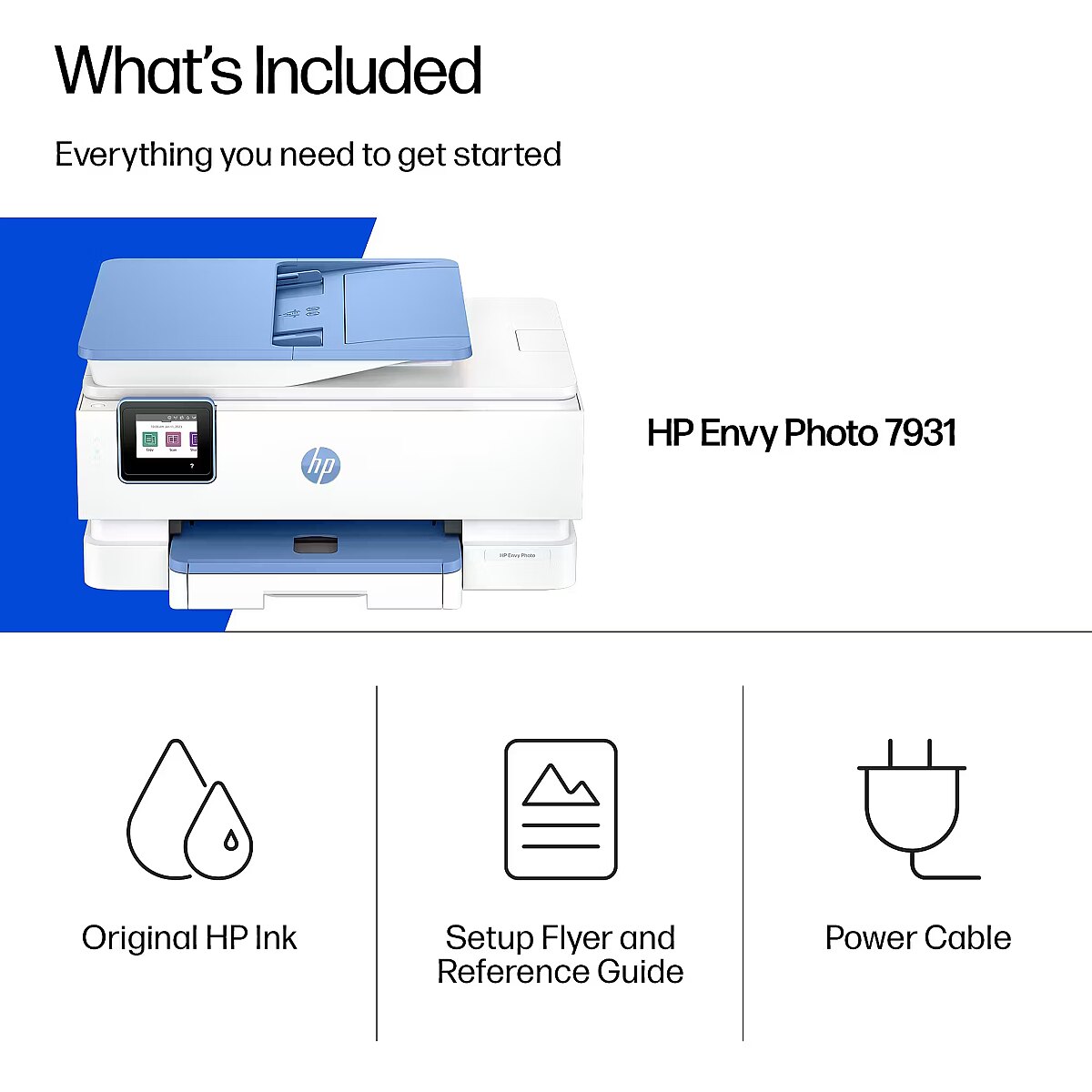 Technical details - Box contents - HP Envy Photo 7931 All-in-one Printer; HP 303 Setup Black Original Ink Cartridge; HP Setup Tri-color Original Ink Cartridge; Setup Guide; Reference Guide; Power cord