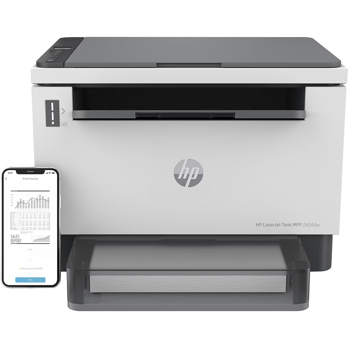 Powerful productivity. Super available addition. Discover business-ready opportunities and savings with the HP LaserJet Tank MFP 2604dw all-in-one printer pre-filled with up to 5,000 pages of original HP toner.[1]