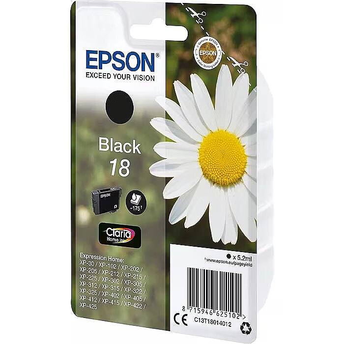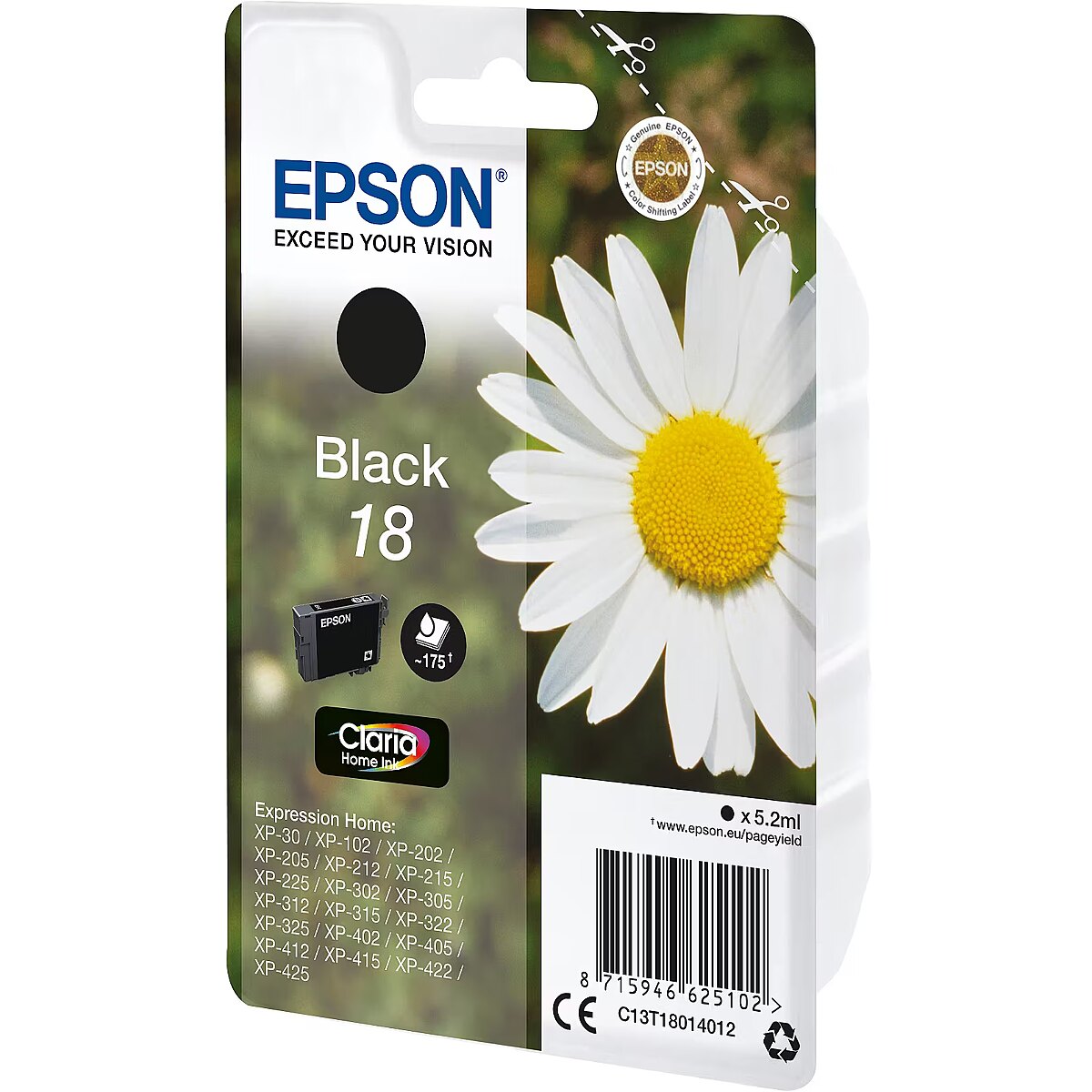 LongSummaryDescription - Epson Daisy Singlepack Black 18 Claria Home Ink. Cartridge capacity: Standard Yield, Black ink type: Pigment-based ink, Black ink volume: 5.2 ml, Printing colours: Black, Quantity per pack: 1 pc(s), Black ink page yield: 175 pages