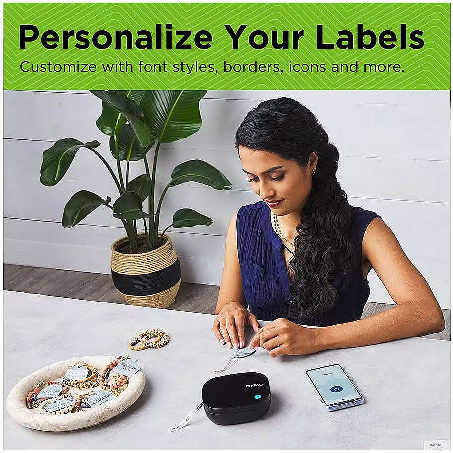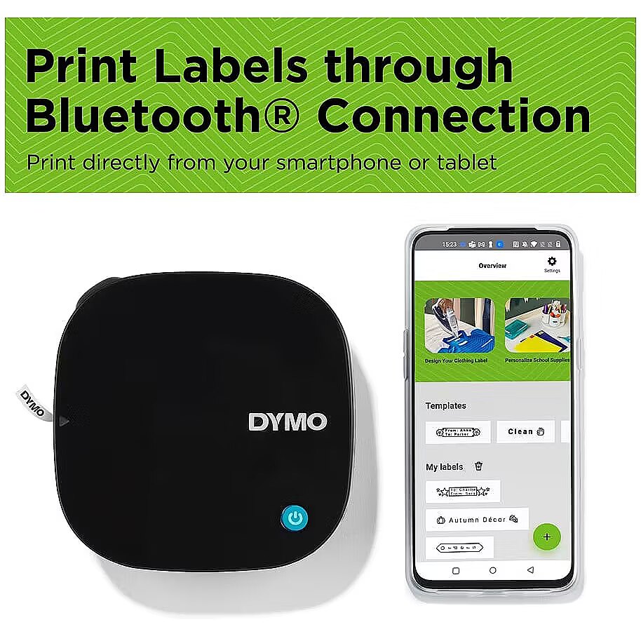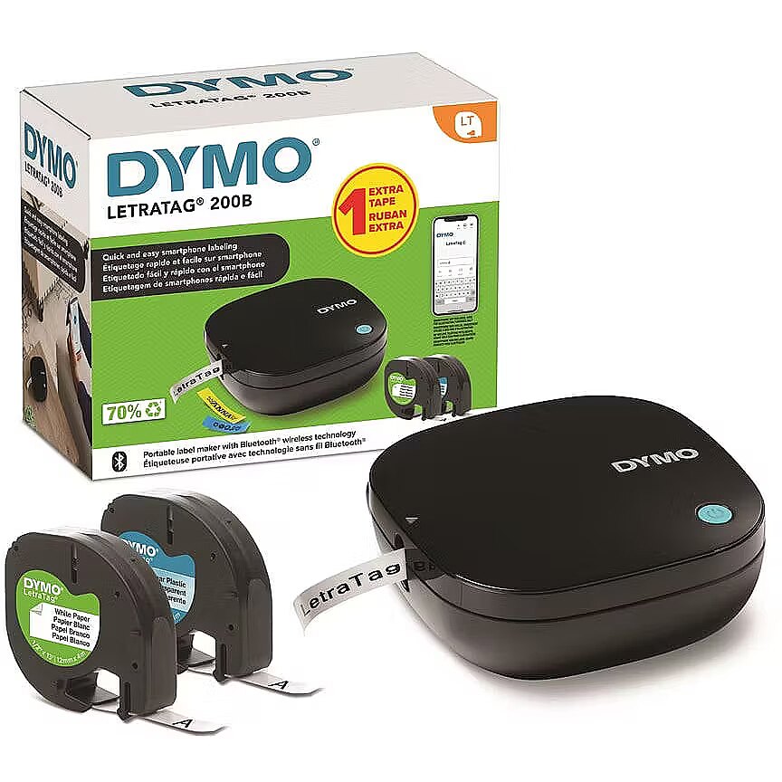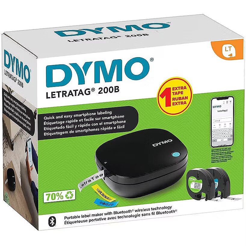description_en - The portable DYMO® LetraTag® 200 Bluetooth lets you print a variety of label types and colors directly from your smartphone or tablet. Organize your home and office easily with the intuitive LetraTag® Connect mobile app. The LetraTag® 200B fits easily in your bag and is ready to use in seconds, thanks to the automatic Bluetooth connection. The 200B works with authentic LetraTag® labels, with an outer cassette made from 100% recycled material. The paper labels are FSC® certified. Ideal for all labeling needs; from storing your kitchen, bathroom, kids' room or dorm room, to home office and organizing your craft supplies. Automatic Bluetooth connectivity – ready to create labels in seconds, directly from your Apple or Android smartphone Compact, lightweight and battery powered, making it easy to fit in your bag and use on the go For use with original DYMO® LetraTag® labels in a variety of colours and types Easily organize your home, office, or dorm room with customizable labels in 5 font sizes, 15 frame styles, 100+ symbols, and the options to underline, create multiple lines of text, or insert a date LetraTag® Connect app makes label creation even easier 42% lighter compared to the average weight of the LetraTag 100T and 100H Operates on 4 AA batteries (not included) Auto power-off function saves energy Pack includes one white plastic tape and one white paper tape