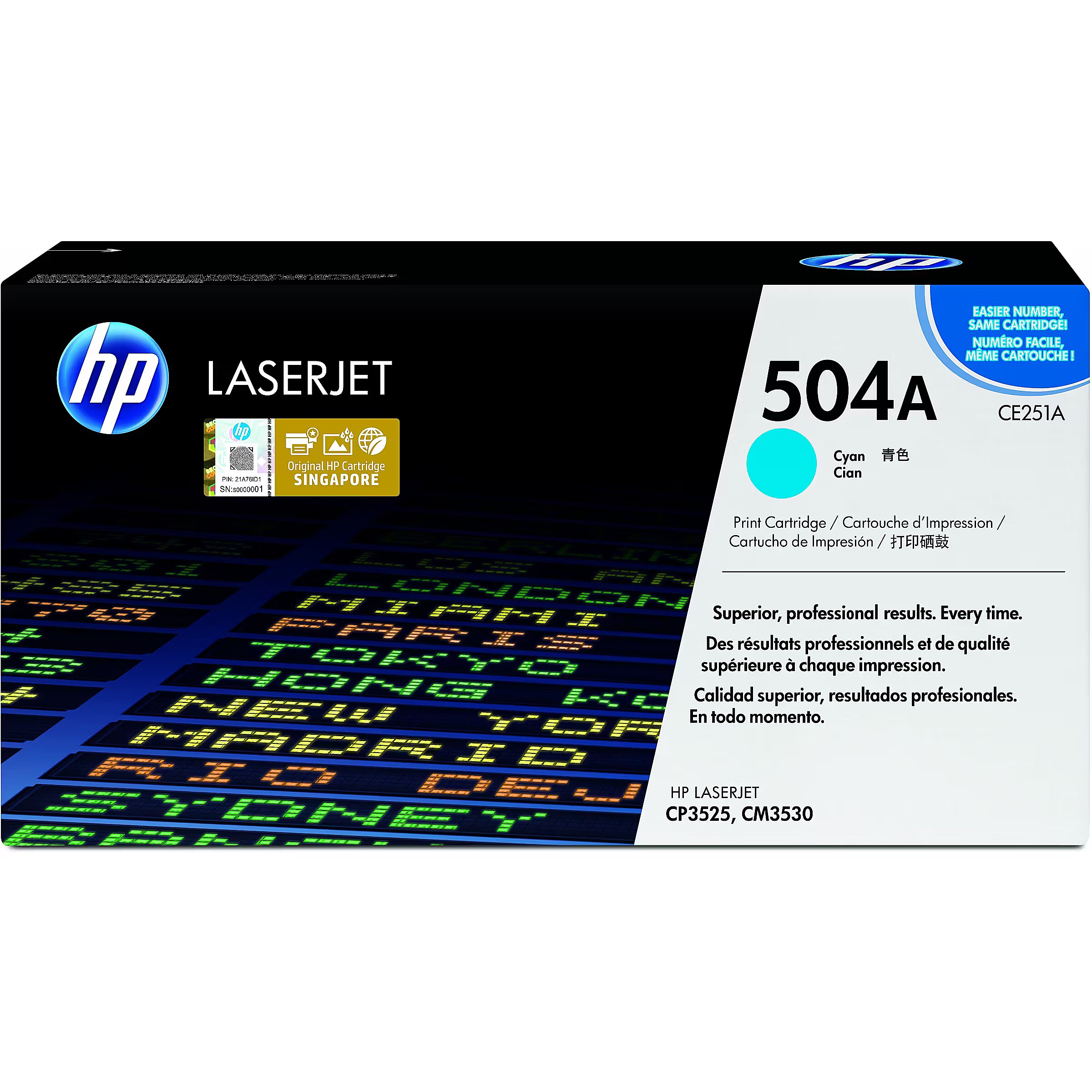 LongDesc - Ideal for general office black-and-white and colour printing and in-house marketing printing.HP 504A Cyan LaserJet Toner Cartridges with improved HP ColorSphere toner provide fast, professional results. Get reliable, consistent performance from everyday documents to marketing materials, and time-saving supplies management features.