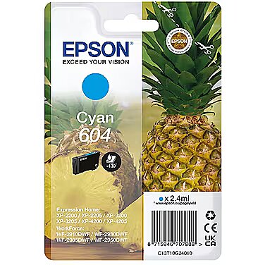 LongDesc - Providing a low-cost yet reliable printing solution, these individual inks benefit from Epson’s extensive research and development.Epson's reliable four colour individual inks are ideal for everyday printing. There’s an affordable cartridge to suit every type of user, with both standard and XL sizes available in Single and Multipacks. Find them easily in store by looking for the Pineapple image.Low cost yet reliableEnjoy reliable, prints with minimal outlay using Epson's four-colour 604 inks. Thanks to the combination of dye colours and pigment black inks, this ink set produces clear and colourful prints.Reduce your printing costs with XL inksOffering great value, inks are supplied individually so you only ever have to replace the colour used. Plus with XL cartridges, you can print up to 500 black and 350 colour pages1.Optimised for Epson printersEpson inks and papers have been developed to work hand-in-hand with Epson printers to produce the best results time and time again. Epson also provides a recycling programme for ink cartridges.The genuine articleEnjoy hassle-free and reliable printing with Epson's genuine inks. We invest in extensive research, high-tech manufacturing facilities and put our products through rigorous tests, to deliver the best quality product to you.Genuine Epson EasyMail packagingOnline ink purchases can be conveniently delivered to you at home, with our EasyMail packaging. And what’s great is, we’ve designed the packaging so that it’s compact enough to fit through most letterboxes. Preventing unnecessary trips to collect deliveries.
