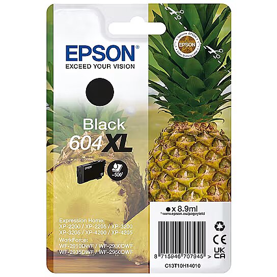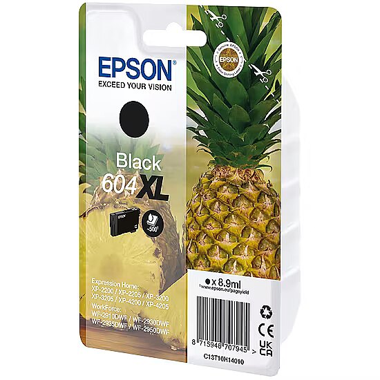 LongDesc - Providing a low-cost yet reliable printing solution, these individual inks benefit from Epson’s extensive research and development.Epson's reliable four colour individual inks are ideal for everyday printing. There’s an affordable cartridge to suit every type of user, with both standard and XL sizes available in Single and Multipacks. Find them easily in store by looking for the Pineapple image.Low cost yet reliableEnjoy reliable, prints with minimal outlay using Epson's four-colour 604 inks. Thanks to the combination of dye colours and pigment black inks, this ink set produces clear and colourful prints.Reduce your printing costs with XL inksOffering great value, inks are supplied individually so you only ever have to replace the colour used. Plus with XL cartridges, you can print up to 500 black and 350 colour pages1.Optimised for Epson printersEpson inks and papers have been developed to work hand-in-hand with Epson printers to produce the best results time and time again. Epson also provides a recycling programme for ink cartridges.The genuine articleEnjoy hassle-free and reliable printing with Epson's genuine inks. We invest in extensive research, high-tech manufacturing facilities and put our products through rigorous tests, to deliver the best quality product to you.Genuine Epson EasyMail packagingOnline ink purchases can be conveniently delivered to you at home, with our EasyMail packaging. And what’s great is, we’ve designed the packaging so that it’s compact enough to fit through most letterboxes. Preventing unnecessary trips to collect deliveries.