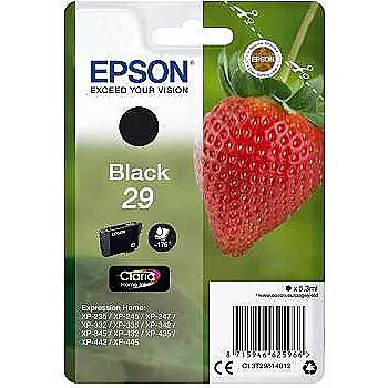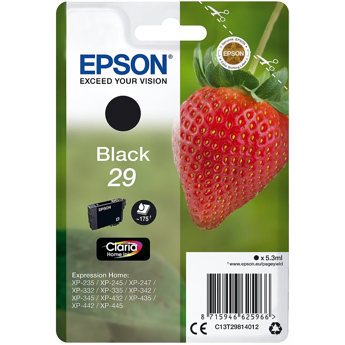 LongSummaryDescription - Epson Strawberry Singlepack Black 29 Claria Home Ink. Cartridge capacity: Standard Yield, Black ink type: Pigment-based ink, Black ink volume: 5.3 ml, Printing colours: Black, Quantity per pack: 1 pc(s), Black ink page yield: 175 pages
