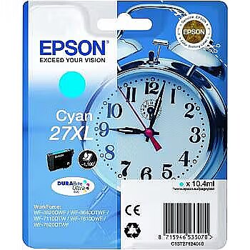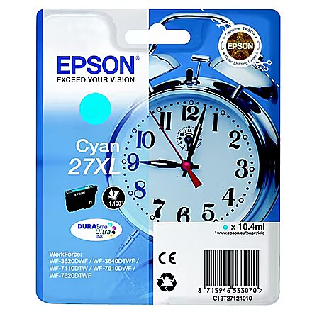 LongSummaryDescription - Epson Alarm clock Singlepack Cyan 27XL DURABrite Ultra Ink. Cartridge capacity: High (XL) Yield, Colour ink page yield: 1100 pages, Colour ink volume: 10.4 ml, Printing colours: Cyan, Quantity per pack: 1 pc(s)