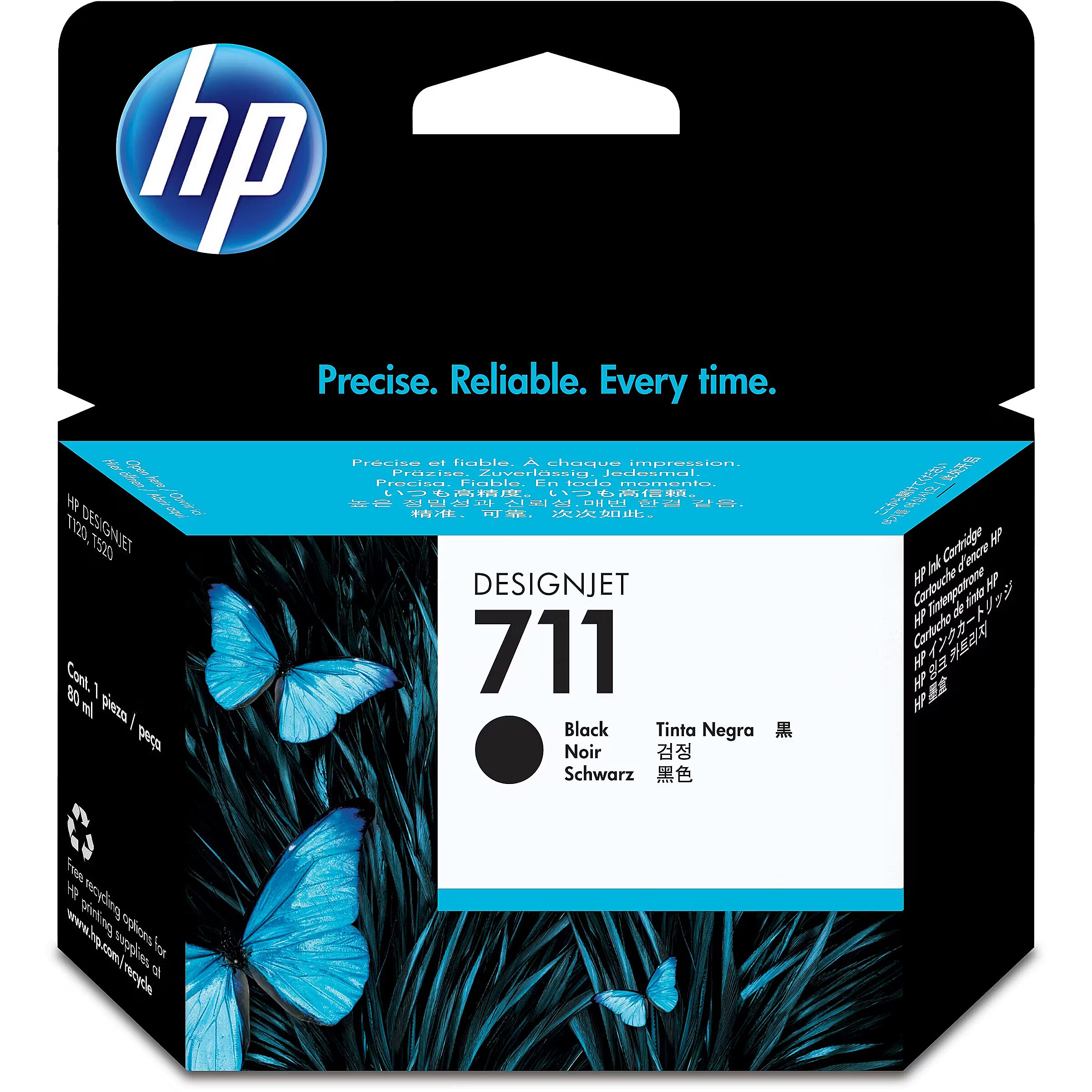 LongSummaryDescription - HP 711 80-ml Black DesignJet Ink Cartridge. Compatibility: HP DesignJet T120, T520, Printing colours: Black, OEM code: CZ133A. Width: 119 mm, Depth: 126 mm, Height: 36 mm. Package width: 1190 mm, Package depth: 1260 mm, Package height: 36 mm. Master (outer) cases per pallet: 100 pc(s), Products per pallet: 4000 pc(s), Layers per pallet: 10 pc(s). Pallet dimensions (W x D x H): 1219 x 1016 x 1956 mm