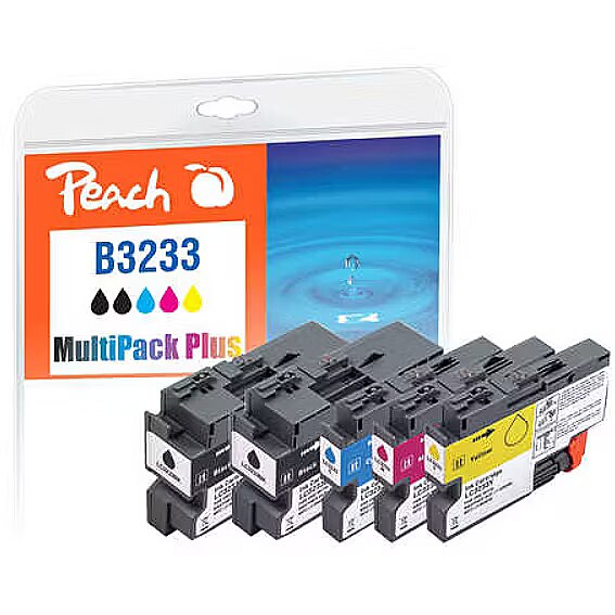 Technical_details - Ink Economy Pack Plus 320995 The ink cartridges Peach 320995 are compatible with the original Brother LC-3233 inks. This set contains two black cartridges and three additional cartridges in cyan, magenta and yellow. The filling quantities are 65 ml for black and 16 ml for the other cartridges. These cartridges are compatible with the Brother DCPJ 1100 DW and Brother MFCJ 1300 DW printers. Type: Ink EAN: 7640460542226 Manufacturer No.: 320995 Printing color: cyan, yellow, magenta, black Good For: Manufacturers | Brother Suitable for: model | Brother DCPJ 1100 DW, Brother MFCJ 1300 DW Consumption: volume | 2x 65ml, 3x 16ml Weight: 475 grams