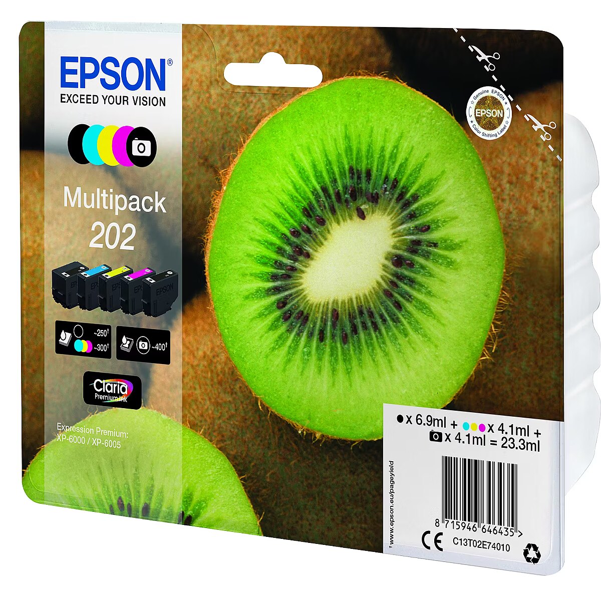 LongSummaryDescription - Epson Kiwi Multipack 5-colours 202 Claria Premium Ink. Colour ink type: Dye-based ink, Cartridge capacity: Standard Yield, Black ink type: Pigment-based ink, Black ink volume: 6.9 ml, Supply type: Multi pack, Colour ink volume: 4.1 ml, Printing colours: Black, Photo black, Cyan, Magenta, Yellow, Quantity per pack: 1 pc(s)