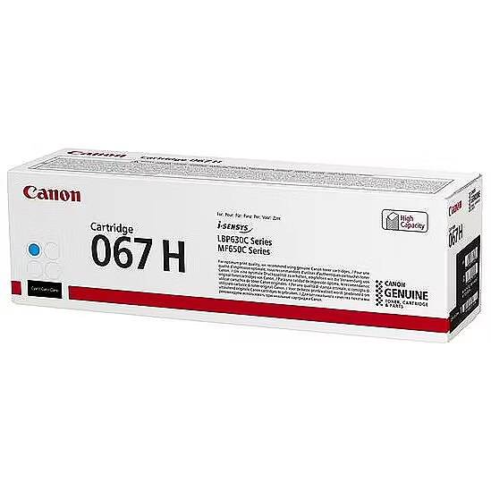 LongDesc - A high yield cyan toner cartridge enabling high quality printing and longevity with compatible i-SENSYS printersUse the high yield cyan toner cartridge 067H with your compatible laser printer to ensure your prints always look their best. A full cartridge yields approximately 2,350 pages (ISO/IEC 19798), providing the longevity needed to handle all your printing demands.- Ensure optimum printing quality with genuine Canon toner- Print more with a high yield cyan cartridge for prints up to 2,350 pages- Compliant with RoHS (2011/65/EU) and its amendments, including (2015/863/EU) and other RoHS-like legislations in countries/regions outside the EU, which means that materials are less hazardous to the environment- Return every toner cartridge to be reused or recycled – it's free, easy and environmentally responsible