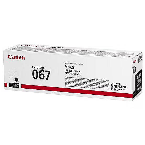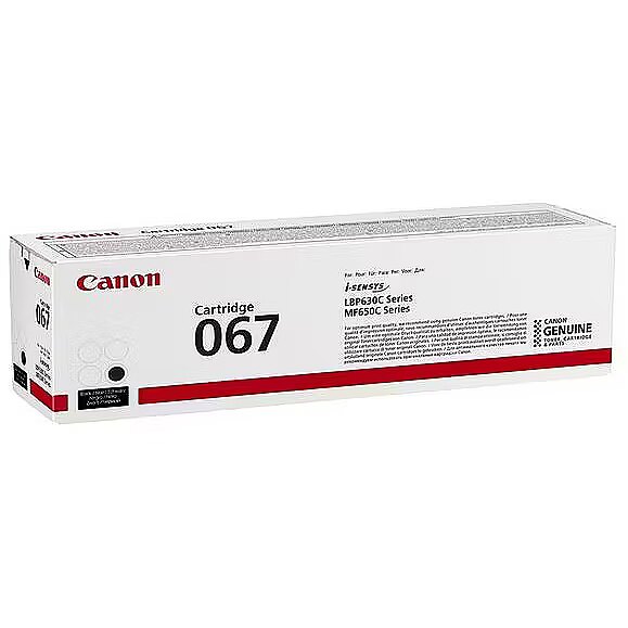 LongDesc - A black toner cartridge enabling high quality printing and longevity with compatible i-SENSYS printersUse the black toner cartridge 067 with your compatible laser printer to ensure your prints always look their best. A full cartridge yields approximately 1,350 pages (ISO/IEC 19798), providing the longevity needed to handle all your printing demands.- Ensure optimum printing quality with genuine Canon toner- Count on yields of up to 1,350 pages with a standard black cartridge- Compliant with RoHS (2011/65/EU) and its amendments, including (2015/863/EU) and other RoHS-like legislations in countries/regions outside the EU, which means that materials are less hazardous to the environment- Return every toner cartridge to be reused or recycled – it's free, easy and environmentally responsible