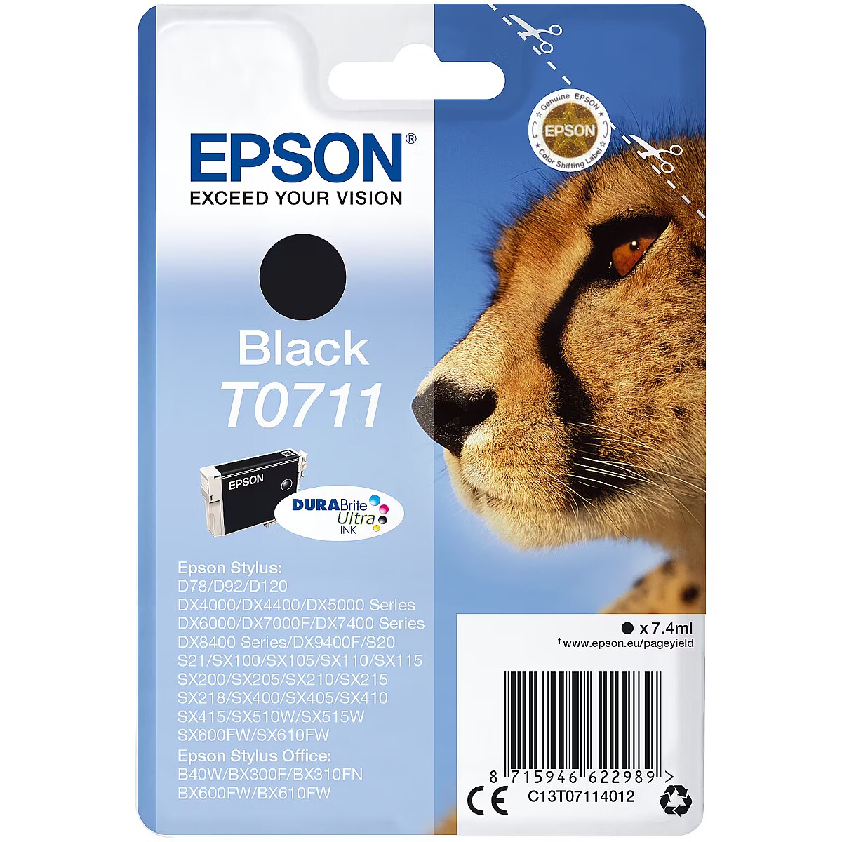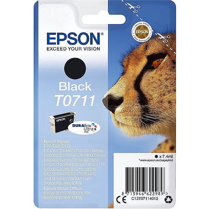 LongSummaryDescription - Epson Cheetah Singlepack Black T0711 DURABrite Ultra Ink. Cartridge capacity: Standard Yield, Black ink type: Pigment-based ink, Black ink volume: 7.4 ml, Printing colours: Black, Quantity per pack: 1 pc(s)