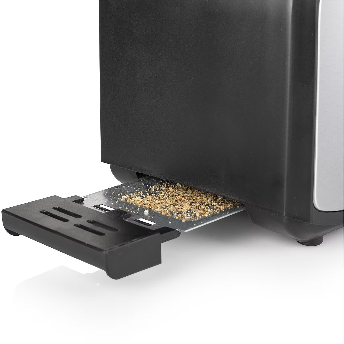 LongDesc - Tristar BR-1022 Toaster – 2 short slots – BlackThe 800 W Tristar BR-1022 Toaster has 2 slots so you can easily toast 2 slices of bread. The removable crumb tray catches every crumb and makes the toaster easy to clean. The stylish black housing has stainless steel accents for a premium look.Two short slotsThe short slots make it possible to toast 2 slices of bread. Select from 6 browning settings from lightly toasted up to golden brown to get the perfect result. As soon as the toast is ready, it will pop-up automatically so you can easily take them out without burning your fingers.Defrost and reheat functionsThe Tristar Toaster also has a defrost and reheat function. The defrost function makes it easy to defrost frozen bread quickly. This means you will always be able to enjoy a fresh slice of bread, even when it comes out of the freezer. The reheat function is perfect if you have a day old bread rolls and want to make these crispy again.Easy to cleanAll crumbs are caught in the slide out crumb tray that makes it easy to clean and you are not left with a mess. If you notice the toasting going too hard, you can stop the toaster with a push on the cancel button and your toast will pop out immediately.Tristar offers you 24 months warranty on all productsWhat’s in the box:Tristar Toaster, instruction manualReasons to choose the Tristar BR-1022 Toaster:800 W toaster suitable for 2 slices of breadConvenient defrost and reheat function for frozen bread and rollsSelect from 6 browning settings for your favorite type of toastEasy to clean thanks to the slide out crumb trayCompact toaster with 800 Watt power for optimal heating