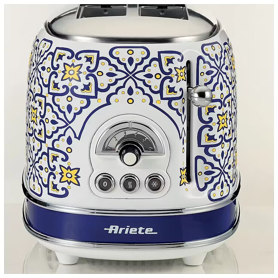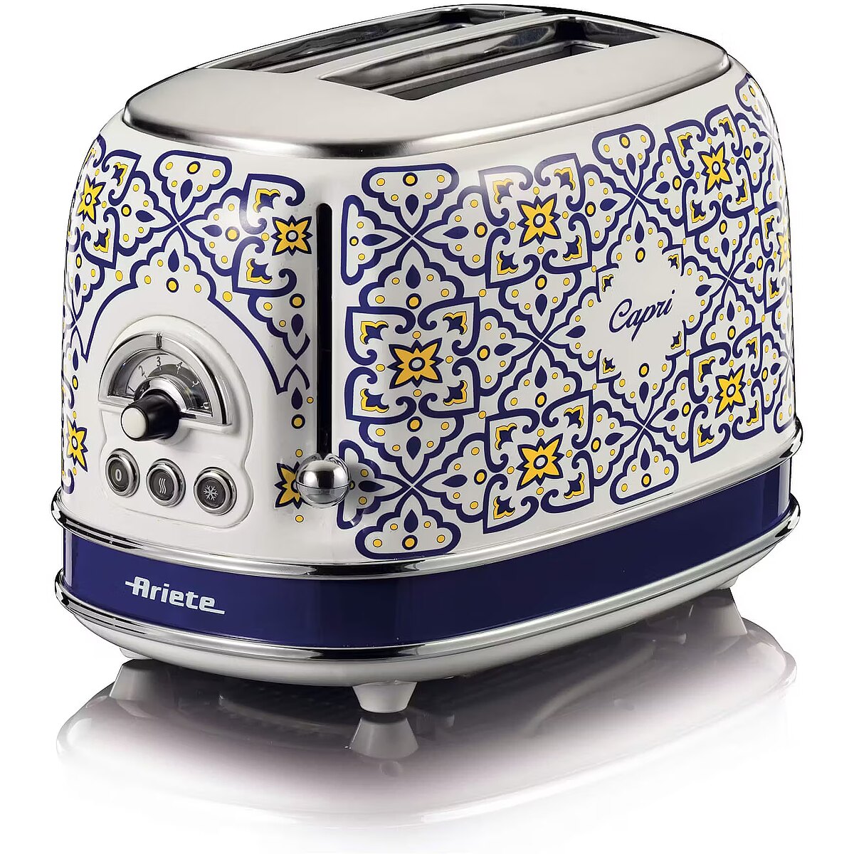 LongDesc - Refined design and cutting-edge functionality to transform your kitchen into an oasis of beauty, the Mediterranean charm of this line is inspired by the unique and vibrant style of the beautiful island of Capri. The electric toaster of the Capri line by Ariete toasts 4 slices of bread at the same time, without clamps, with 2 separate compartments and the possibility to choose the browning level and toasting of the bread that you prefer, thanks to the 6 levels that can be selected using the knob. Slices are automatically ejected once toasted, avoiding unpleasant burns, and the cold walls guarantee maximum safety during use. By toasting 2 slices of bread at the same time, you can quickly prepare toasted bread for your American breakfasts or brunches with friends, but that's not all: with Ariete’s Capri Toaster you can also activate the defrost function to defrost in a few moments and toast sandwiches and stuffed sandwiches, for tasty snacks or quick lunch breaks.